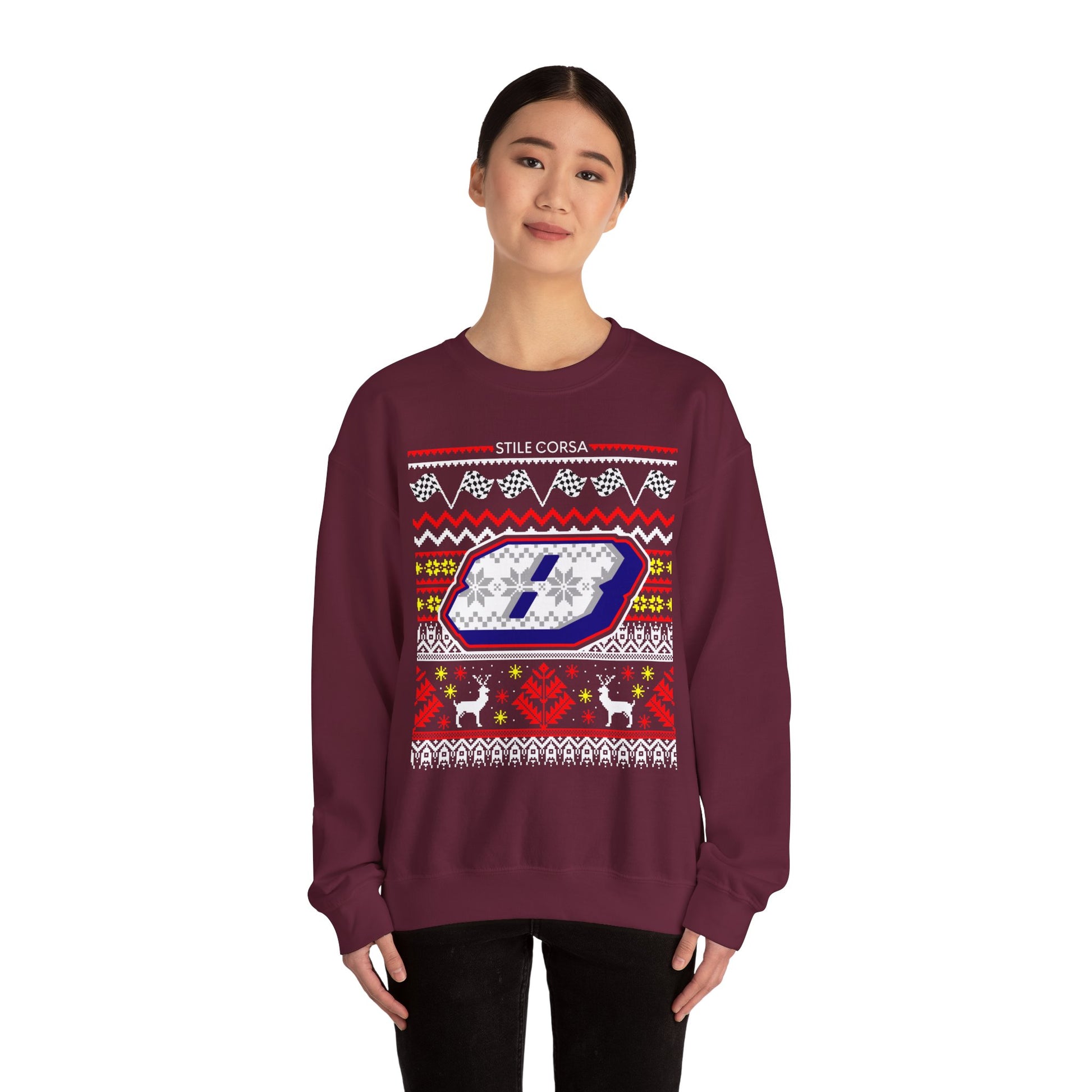 Bring festive racing energy to winter with the Calhoun #8 Winter Charge Crewneck. Made from soft navy fleece with a relaxed unisex fit, it features a holiday racing “ugly sweater” print in white, red, yellow, and blue. Highlights include a red-and-white zigzag with “STILE CORSA”, checkered flags, a bold oval racing badge with “13” in snowflake-filled blue, and playful winter motifs like reindeer, maple leaves, and stars. Ribbed cuffs, hem, and collar ensure a cozy, track-ready fit perfect for winter days on or off the street.