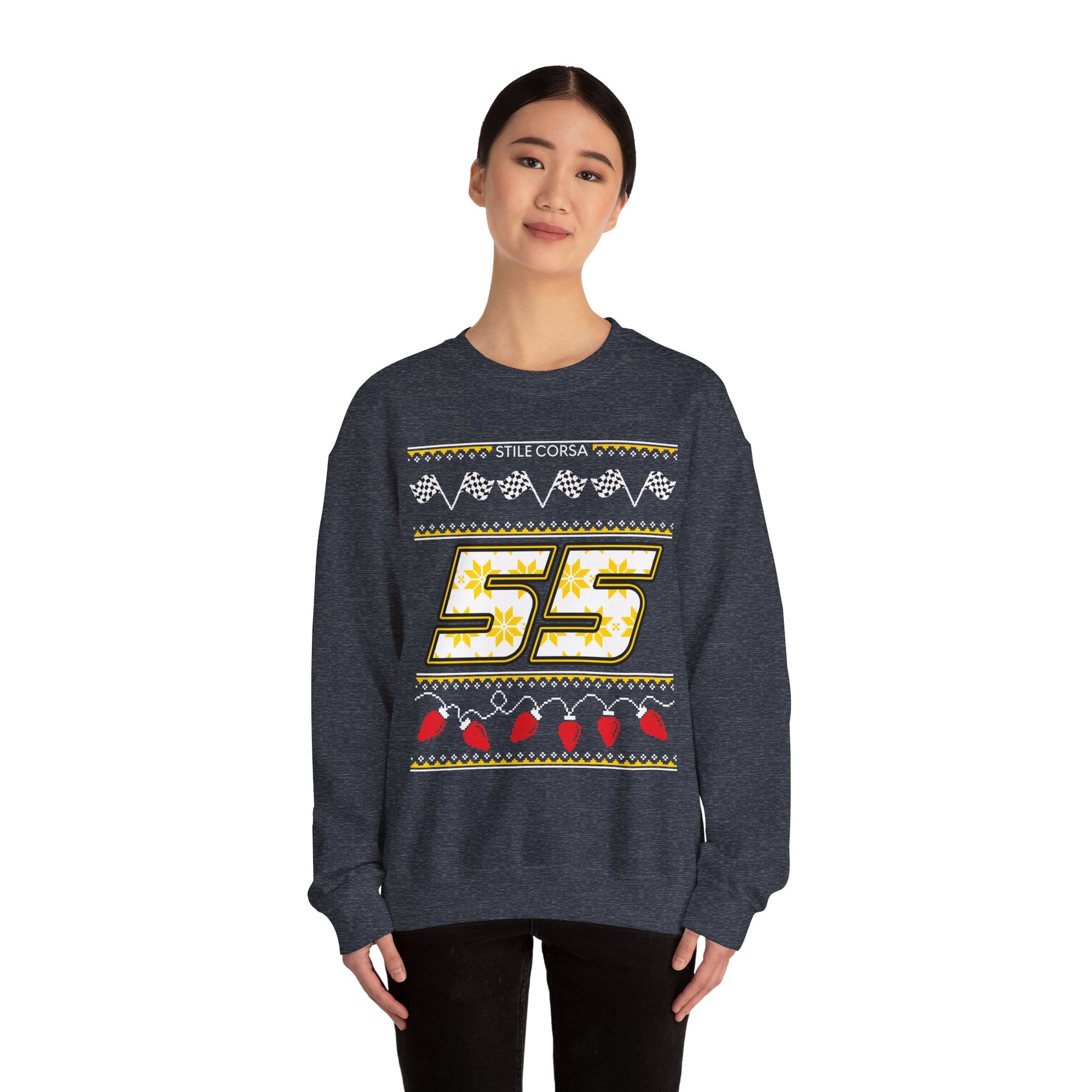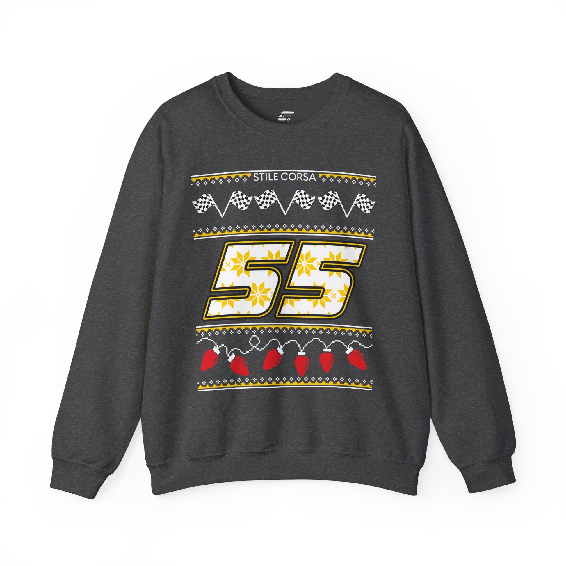 Stay fast, festive, and warm this season with Carson Craig’s #55 Trackside Winter Crewneck. Crafted in rich royal blue fleece with a relaxed unisex fit, this cozy sweatshirt brings the thrill of the track to your holiday wardrobe. The front features a bold racing-inspired “ugly sweater” design: a large #55 in bright yellow with navy outline, filled with delicate white snowflakes, topped with a row of checkered flags, and finished with festive red Christmas lights and geometric accents along the hem. Perfect for fans, drivers, or anyone ready to bring high-speed style to winter days, this crewneck blends motorsport energy, holiday fun, and all-around comfort.