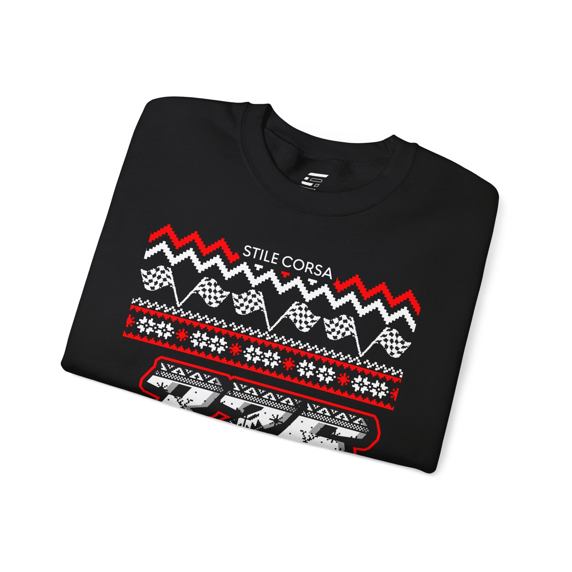 The Crosby #376 Redline Noel Crewneck features a sleek black fleece base with a relaxed unisex fit. The top showcases a red-and-white zigzag band with “STILE CORSA”, followed by five classic checkered racing flags.