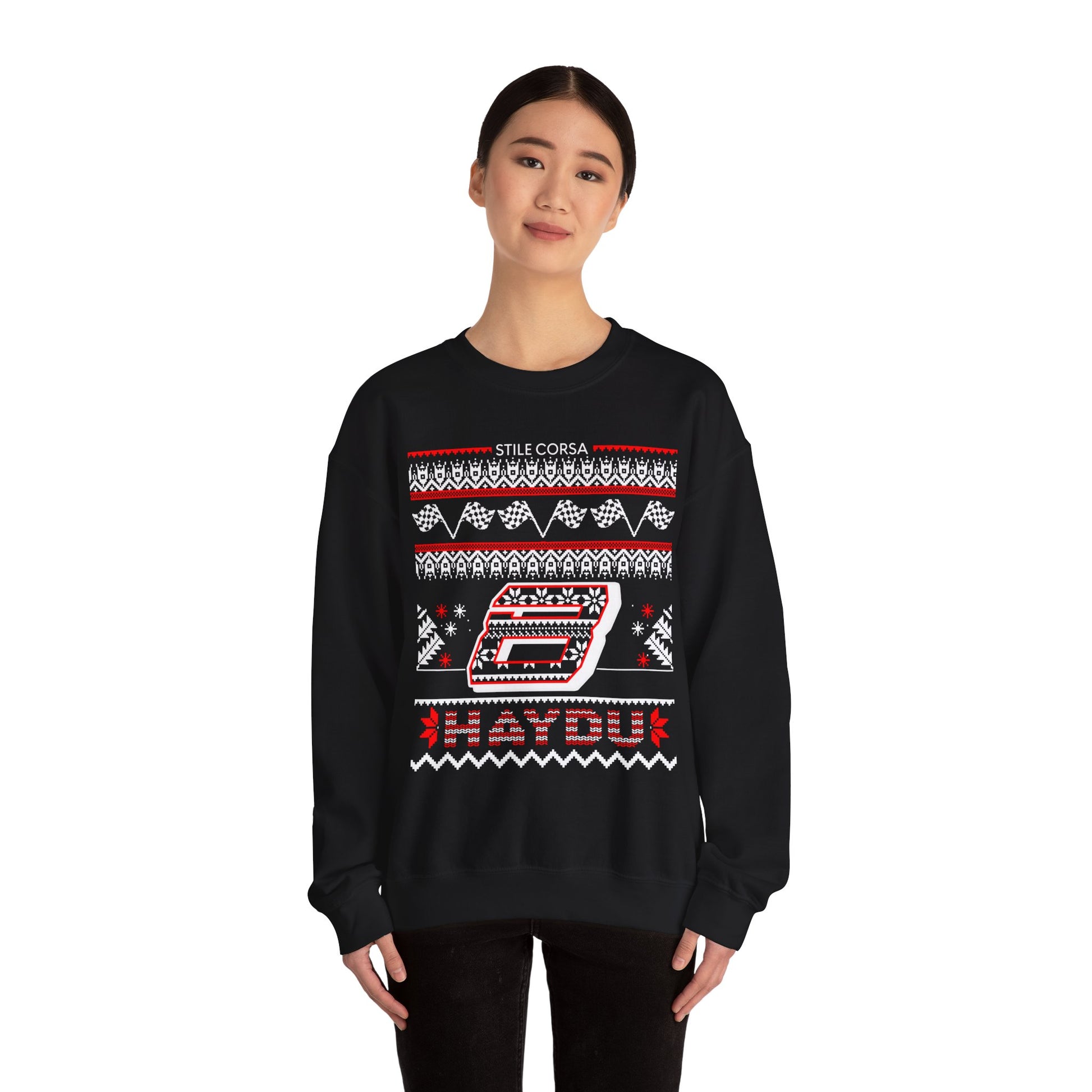 Bring pure rally energy into the winter season with Jack Haydu’s #8 Holiday Crewneck. This black fleece sweatshirt features a bold “ugly sweater” racing design in crisp white and striking red, blending holiday spirit with motorsport edge. Across the top, a Nordic-style geometric band frames the small STILE CORSA mark, followed by a row of black-and-white checkered flags for that unmistakable race-day feel. The centerpiece showcases a stylized top-down rally car in white with black and red accents, filled with a snowflake pattern and flanked by red stars and winter trees. Along the bottom, HAYDU stands out in big red block letters with a snowflake fill, underlined by a white-and-red zigzag border. Cozy, bold, and built for fans—this is winter wear with full-throttle attitude.