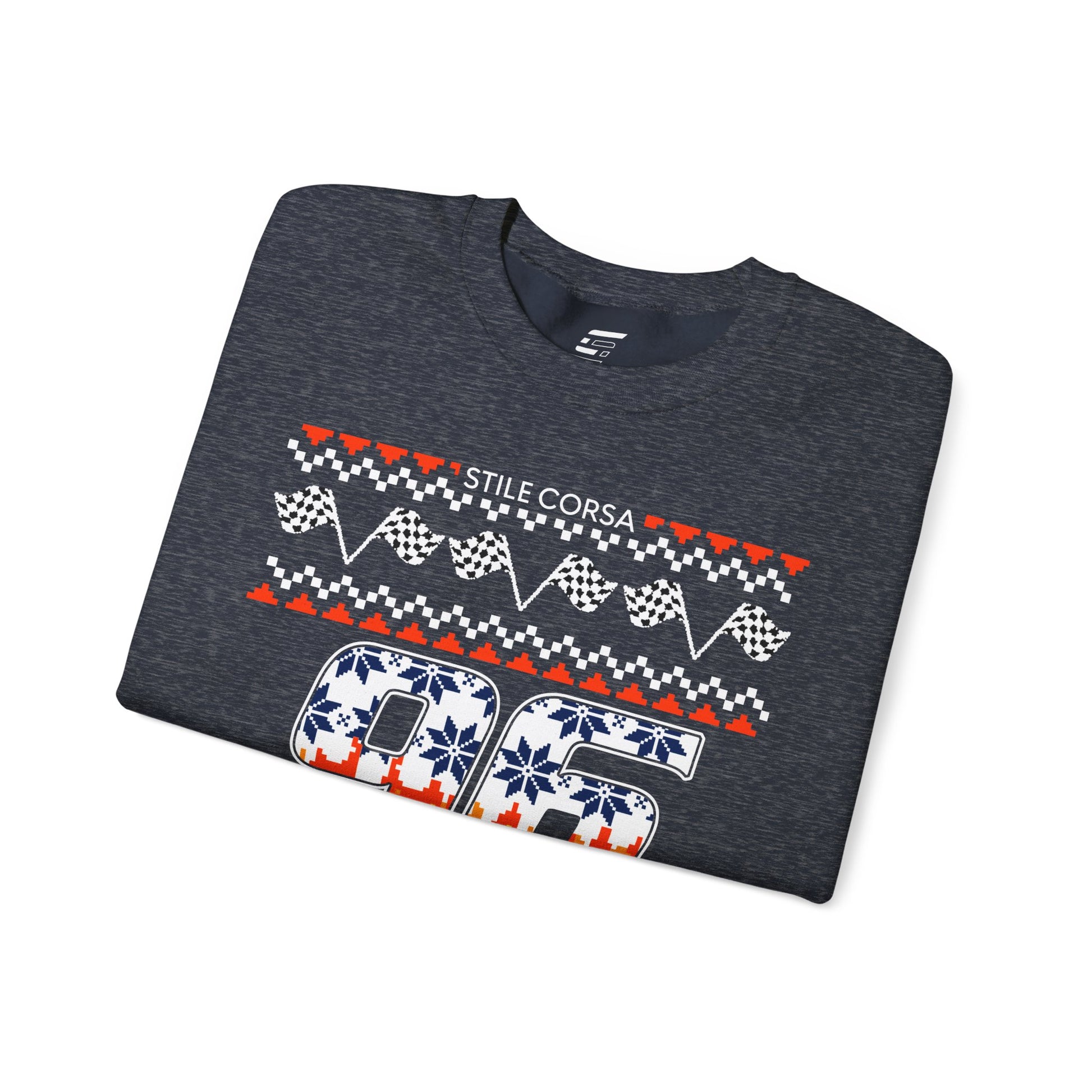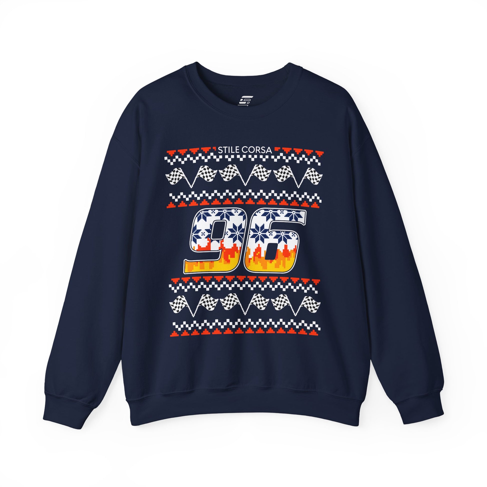 Turn up the heat this season with Nicole Hecker’s #96 Hot Lap Holiday Crewneck. Crafted in royal blue soft fleece, this relaxed unisex sweatshirt keeps you cozy while showing off bold racing spirit. The front features a festive, motorsport-inspired “ugly sweater” print: a large “96” in white snowflake pattern with bottom-half engulfed in fiery orange-yellow flames, surrounded by checkered flags and geometric holiday accents. Perfect for fans, drivers, or anyone looking to combine trackside energy with winter flair, this crewneck blends warmth, style, and high-octane attitude in one statement piece.