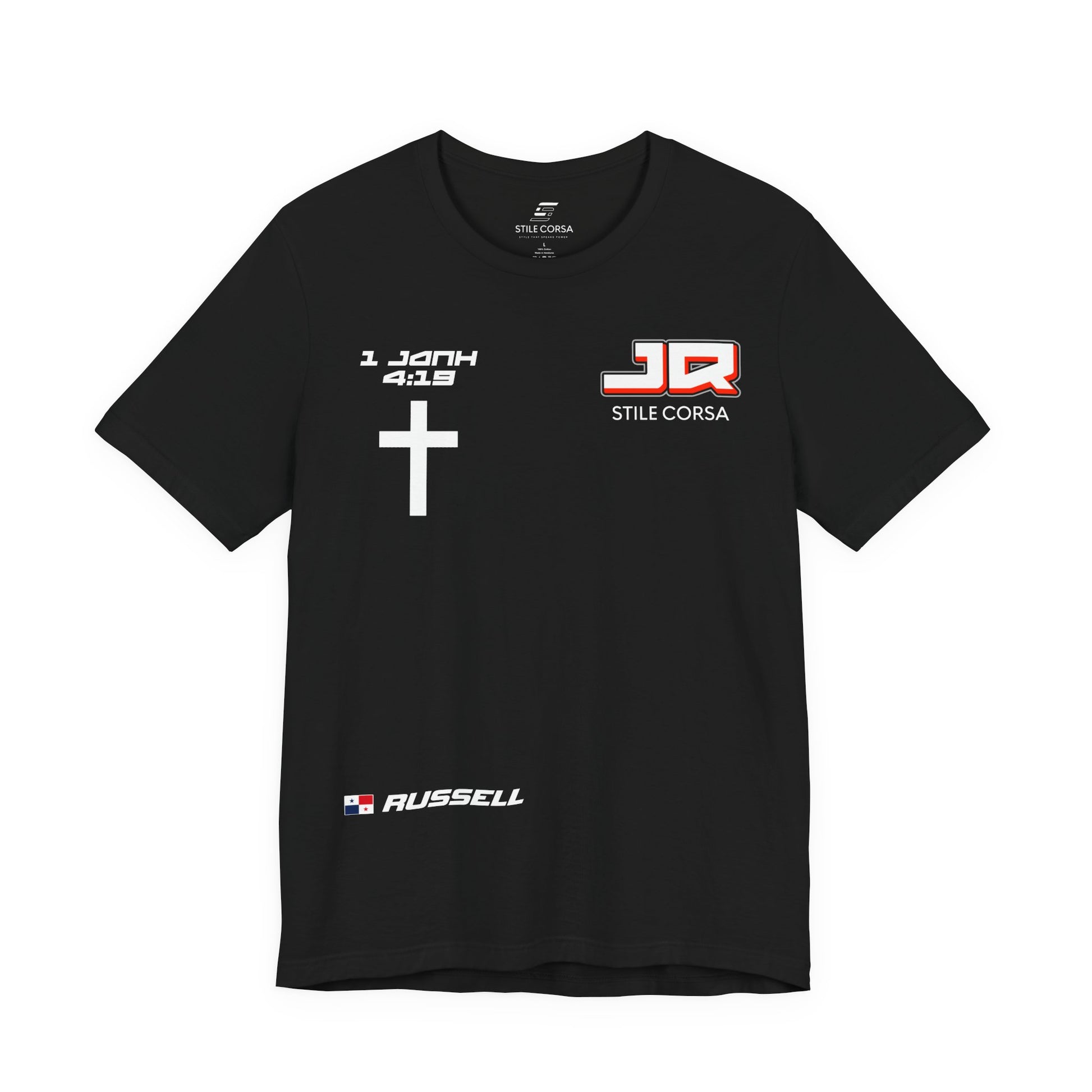 The signature JR logo pops in white with red and orange accents, accompanied by Stile Corsa branding, while RUSSELL and a small American flag on the lower left add patriotic flair. Crafted for comfort and performance, this tee is perfect for trackside action, casual wear, or showing support for Jack Russell wherever you go.