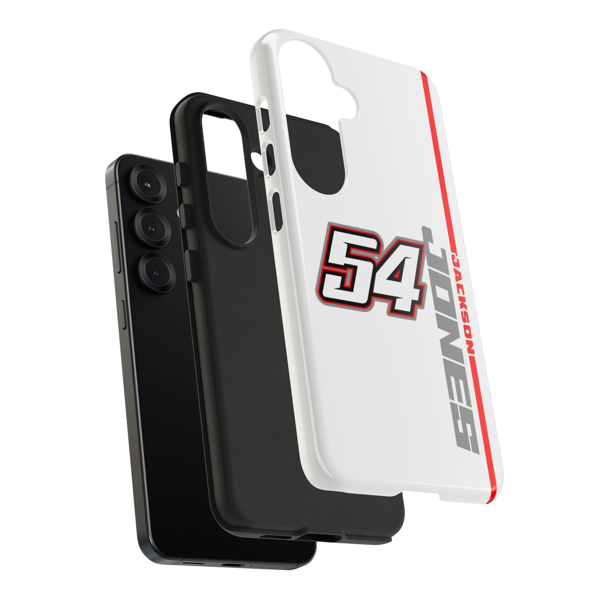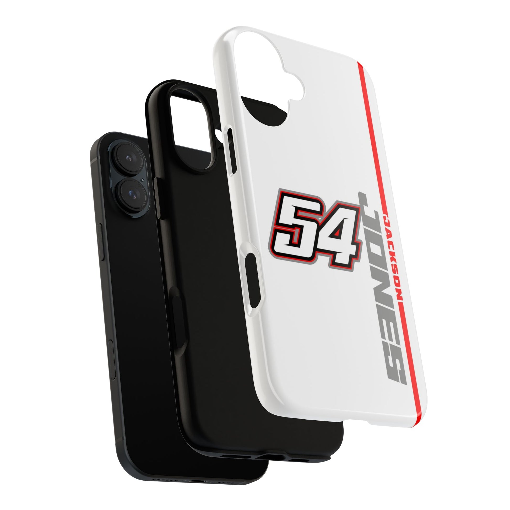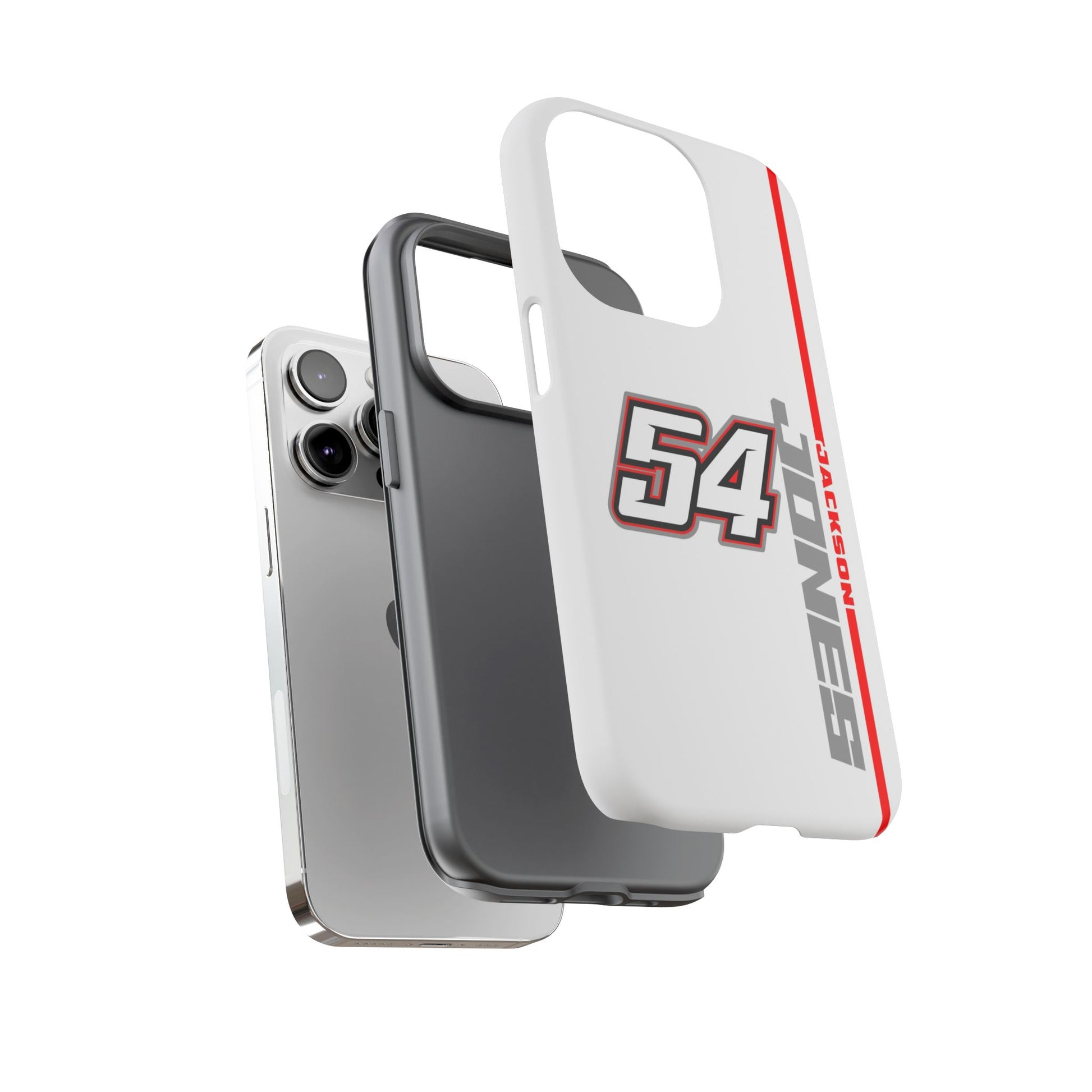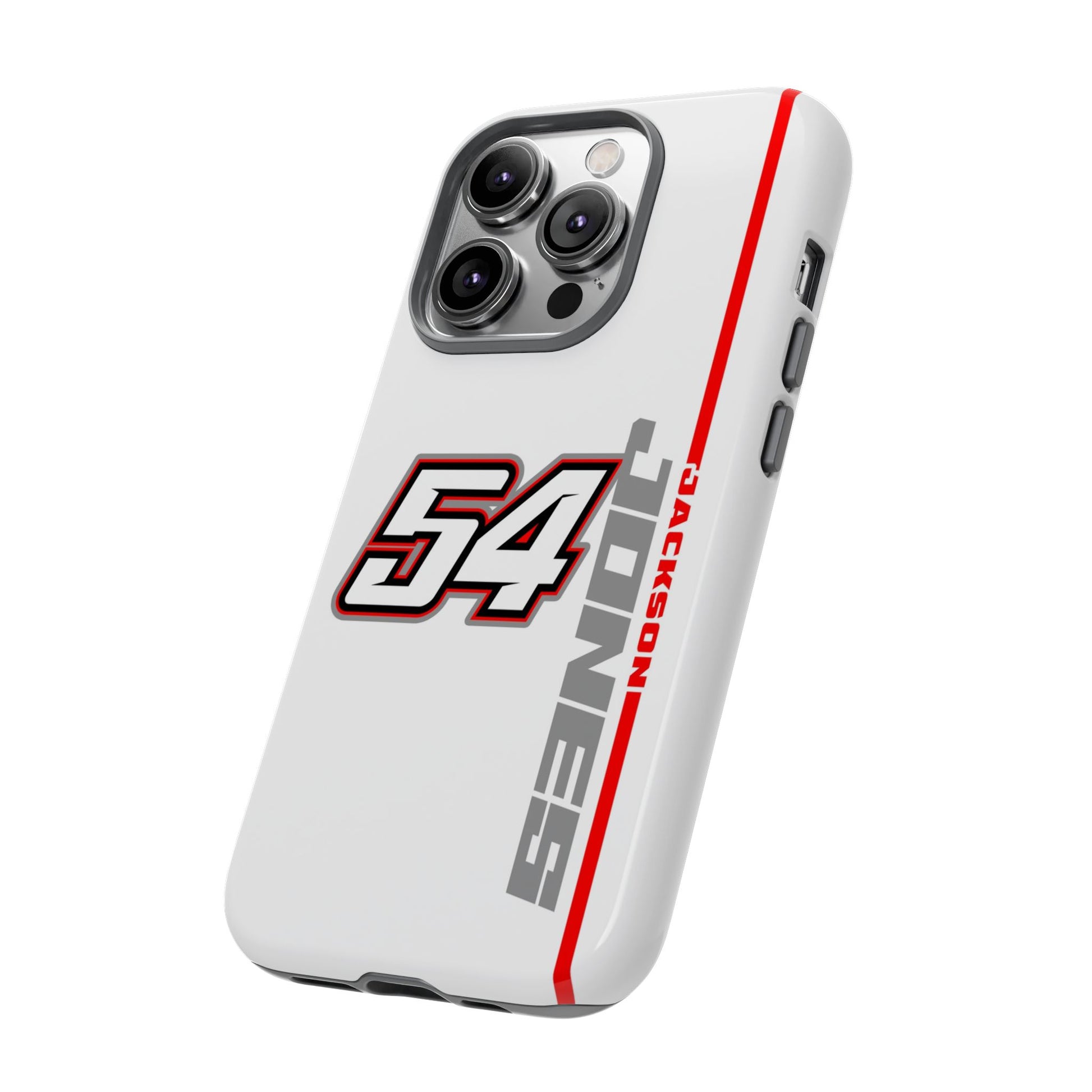 The Jones #54 Case brings sleek precision and racing energy together. Featuring a transparent body that showcases your phone’s natural design, it’s centered by a bold white “54” outlined in red and gray — a nod to the fast, fearless spirit of the track. Along the side, “JACKSON” runs vertically in a clean gray font with a sharp red accent line, adding motion and attitude to every angle. Lightweight, durable, and built for performance — this case embodies Jackson’s signature balance of power and control.