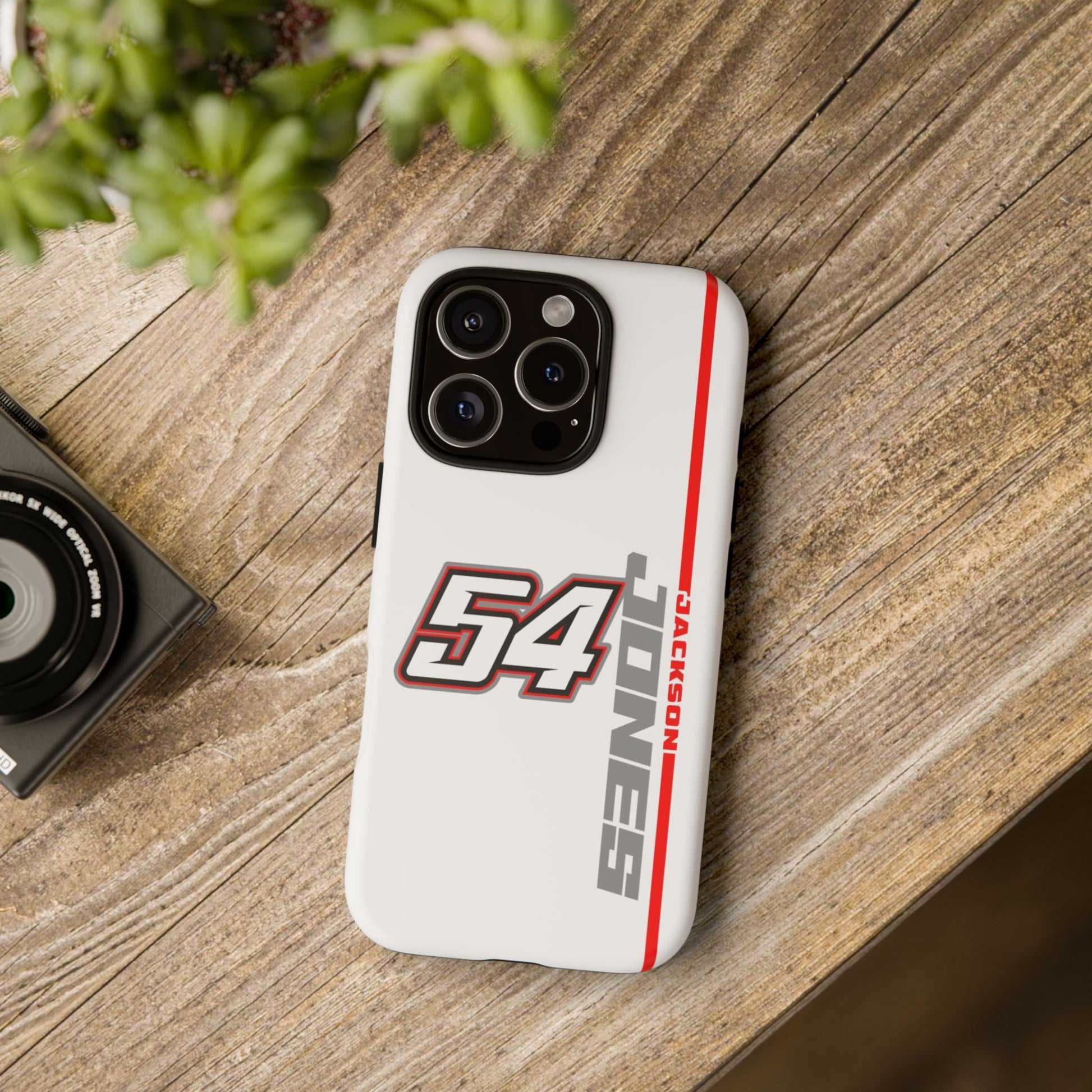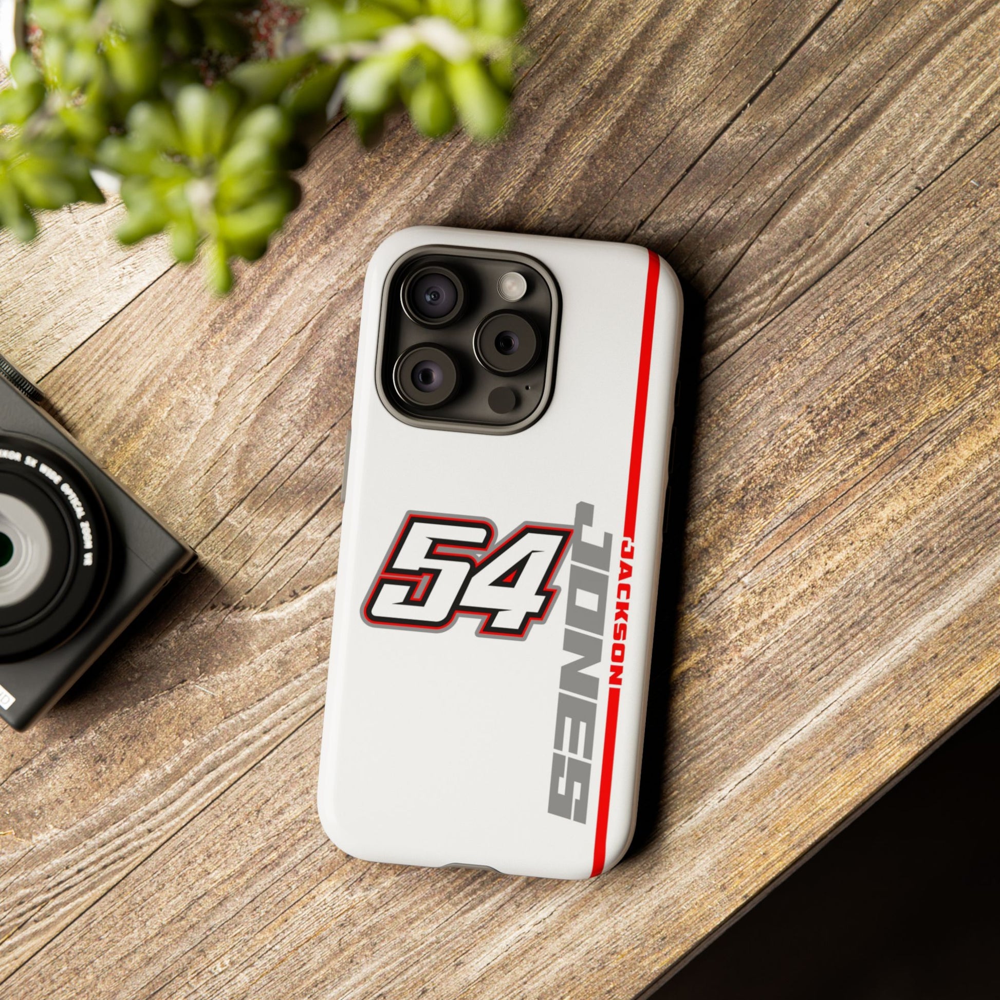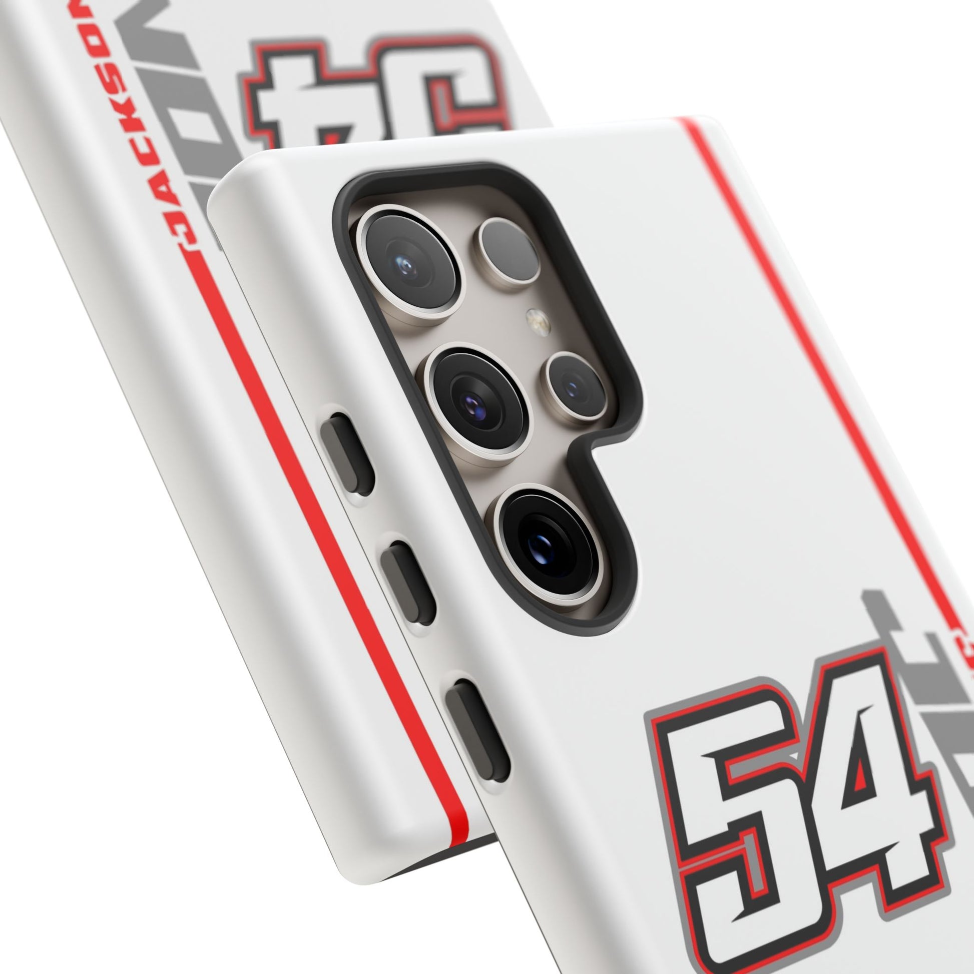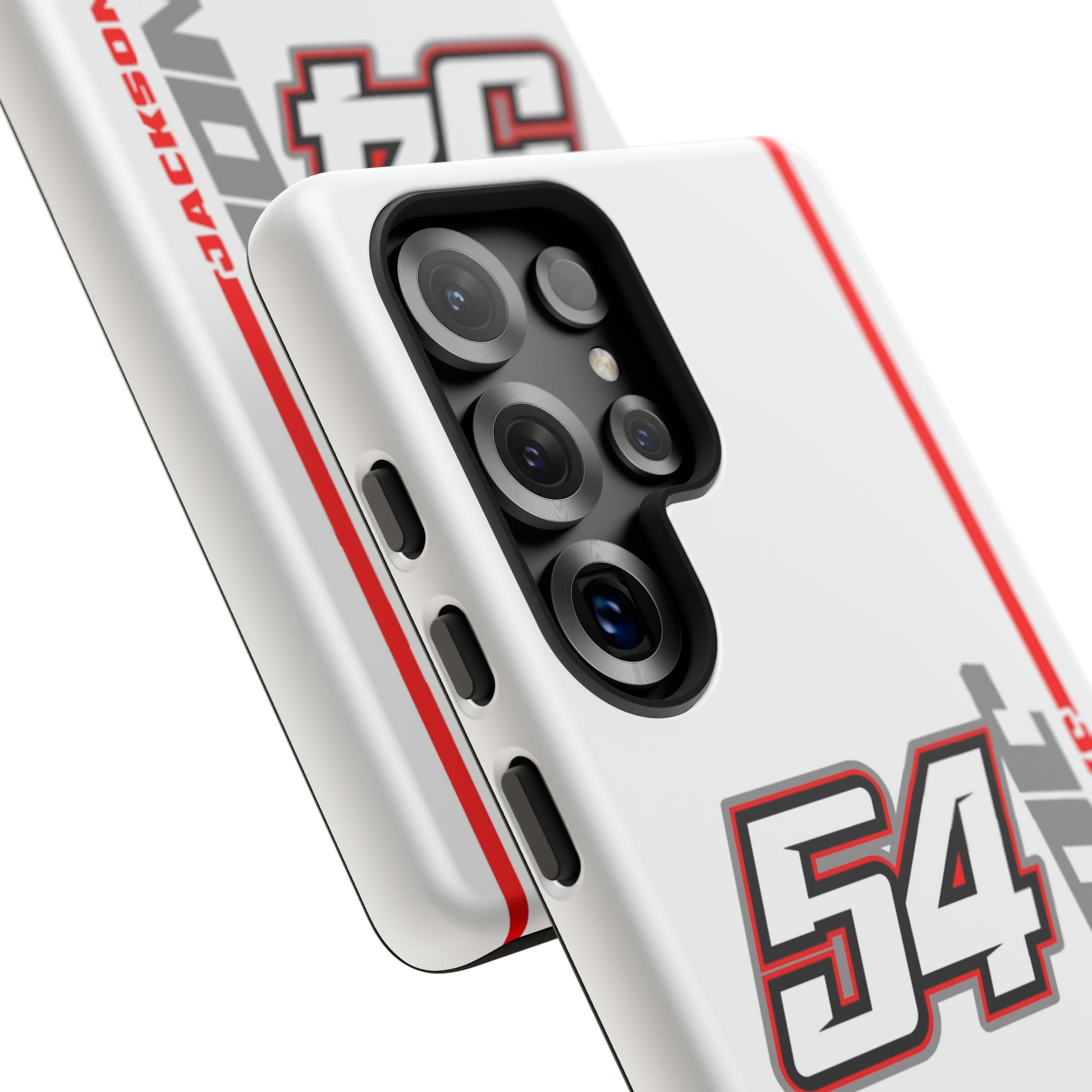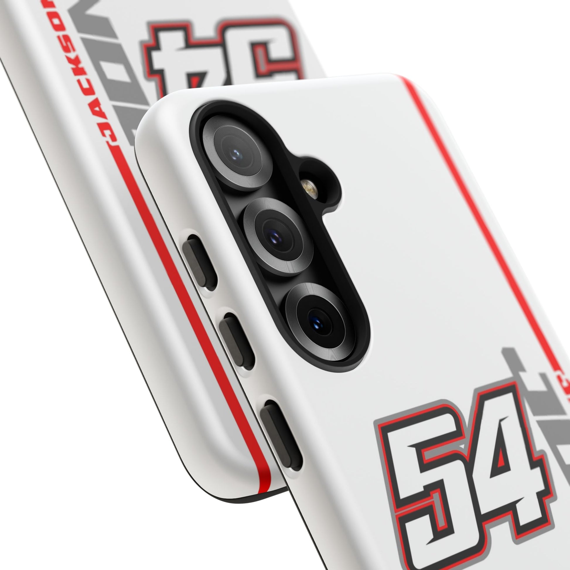 The Jones #54 Case brings sleek precision and racing energy together. Featuring a transparent body that showcases your phone’s natural design, it’s centered by a bold white “54” outlined in red and gray — a nod to the fast, fearless spirit of the track. Along the side, “JACKSON” runs vertically in a clean gray font with a sharp red accent line, adding motion and attitude to every angle. Lightweight, durable, and built for performance — this case embodies Jackson’s signature balance of power and control.