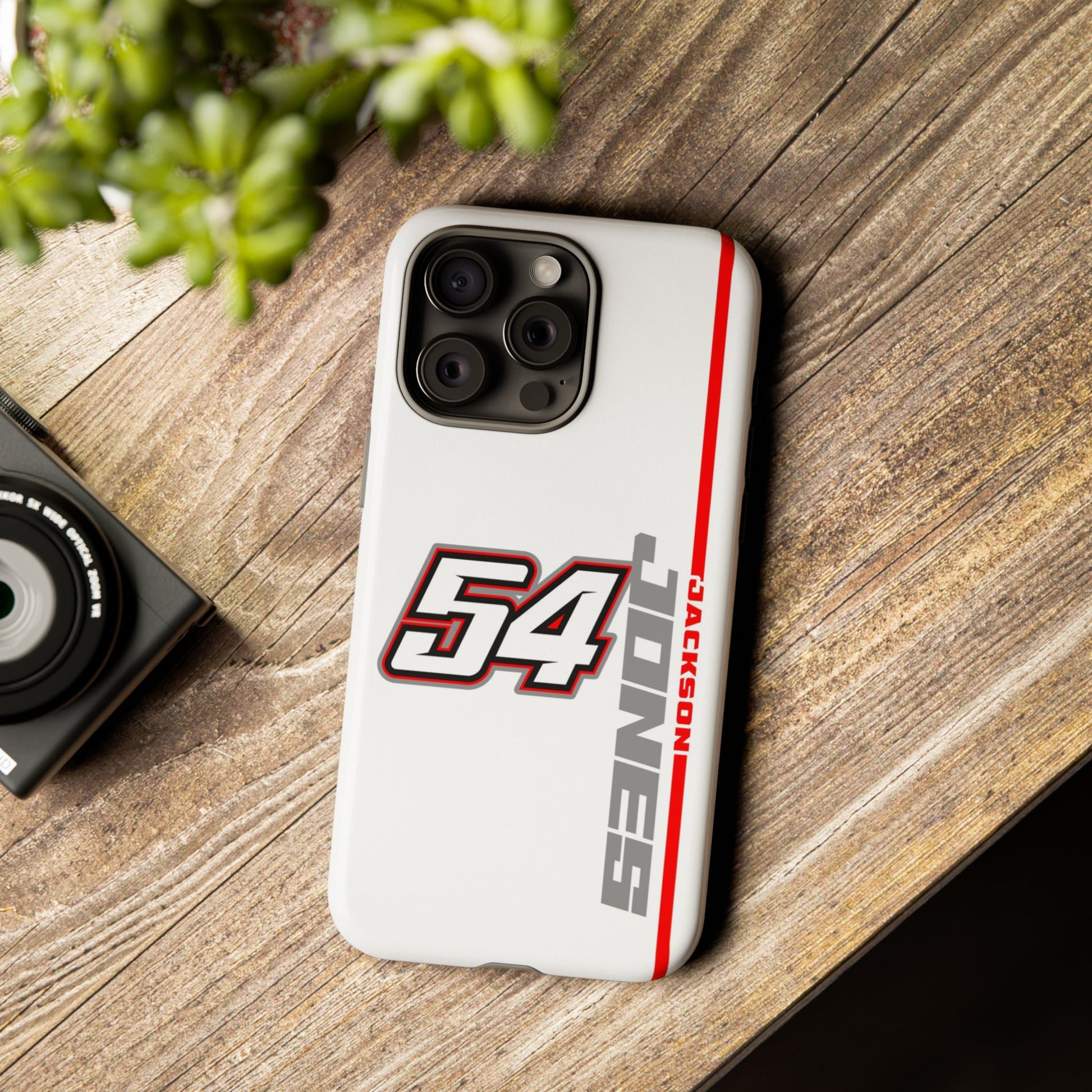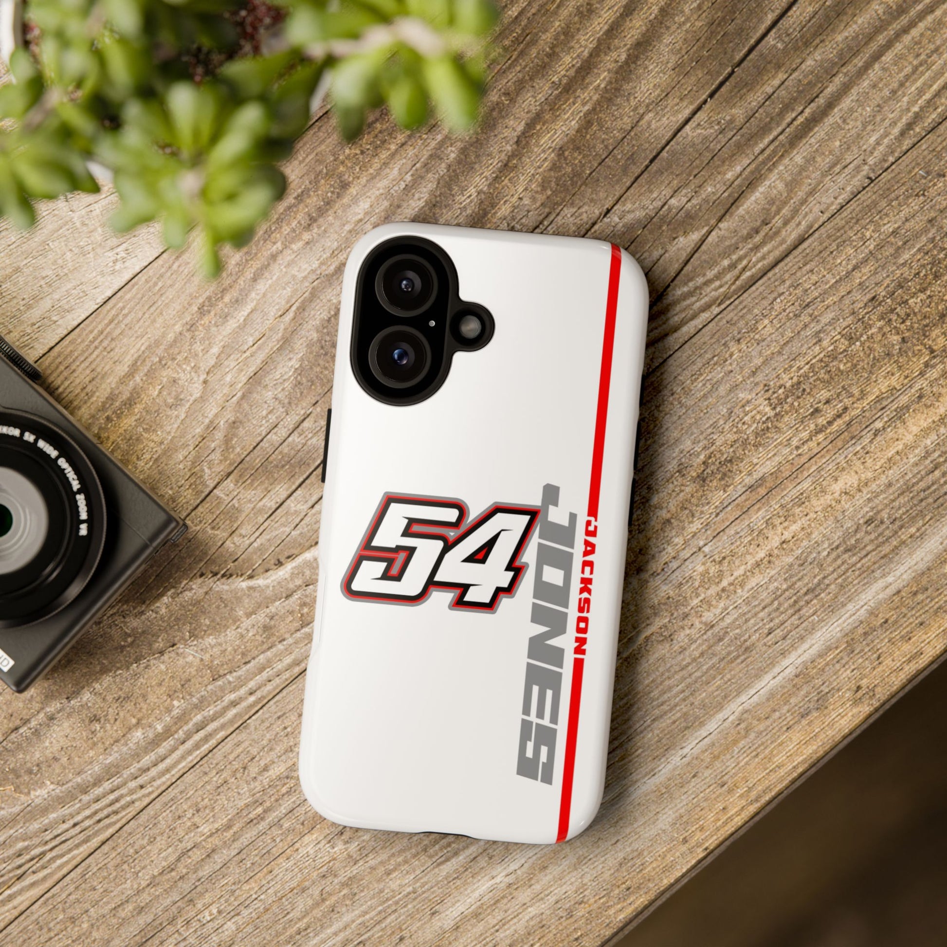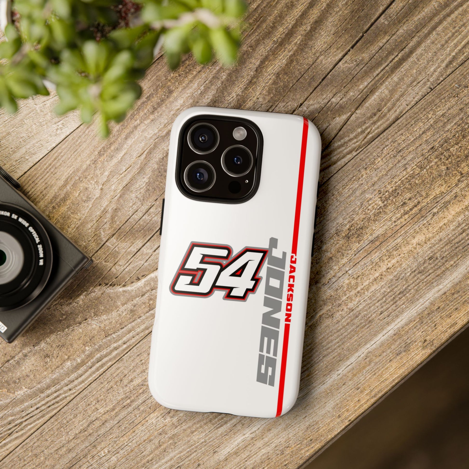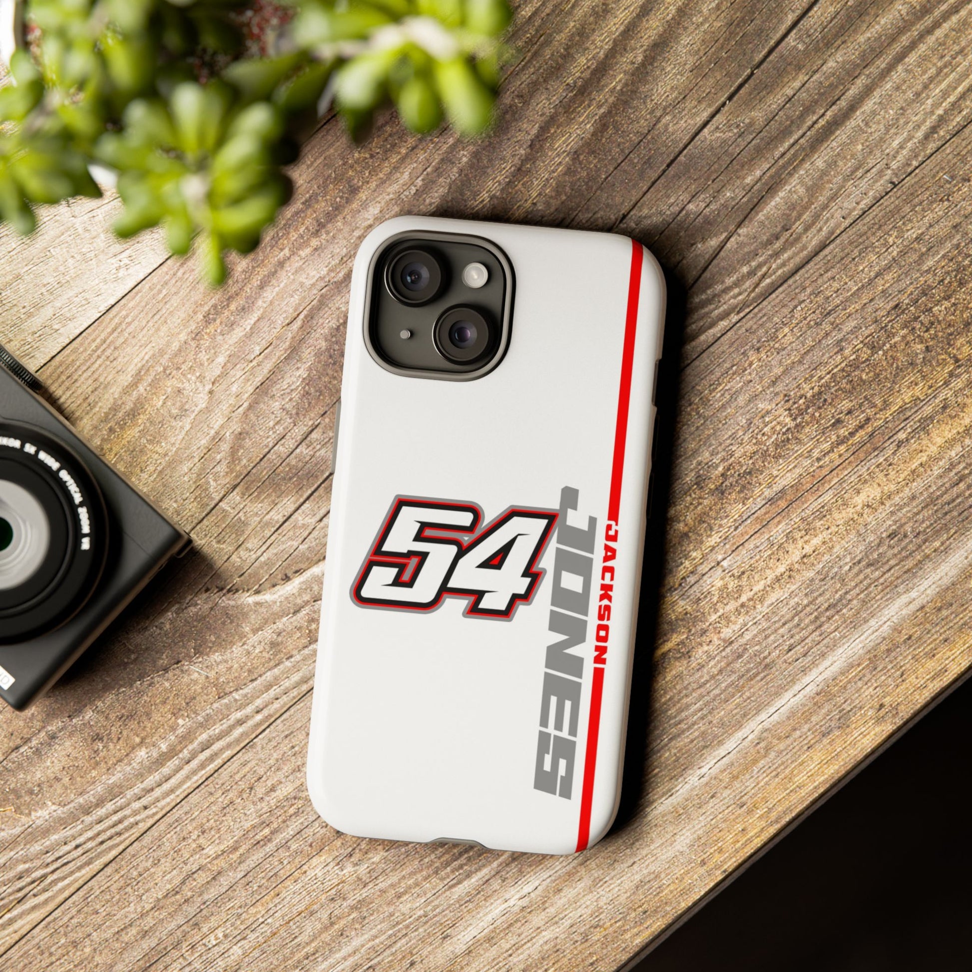 The Jones #54 Case brings sleek precision and racing energy together. Featuring a transparent body that showcases your phone’s natural design, it’s centered by a bold white “54” outlined in red and gray — a nod to the fast, fearless spirit of the track. Along the side, “JACKSON” runs vertically in a clean gray font with a sharp red accent line, adding motion and attitude to every angle. Lightweight, durable, and built for performance — this case embodies Jackson’s signature balance of power and control.