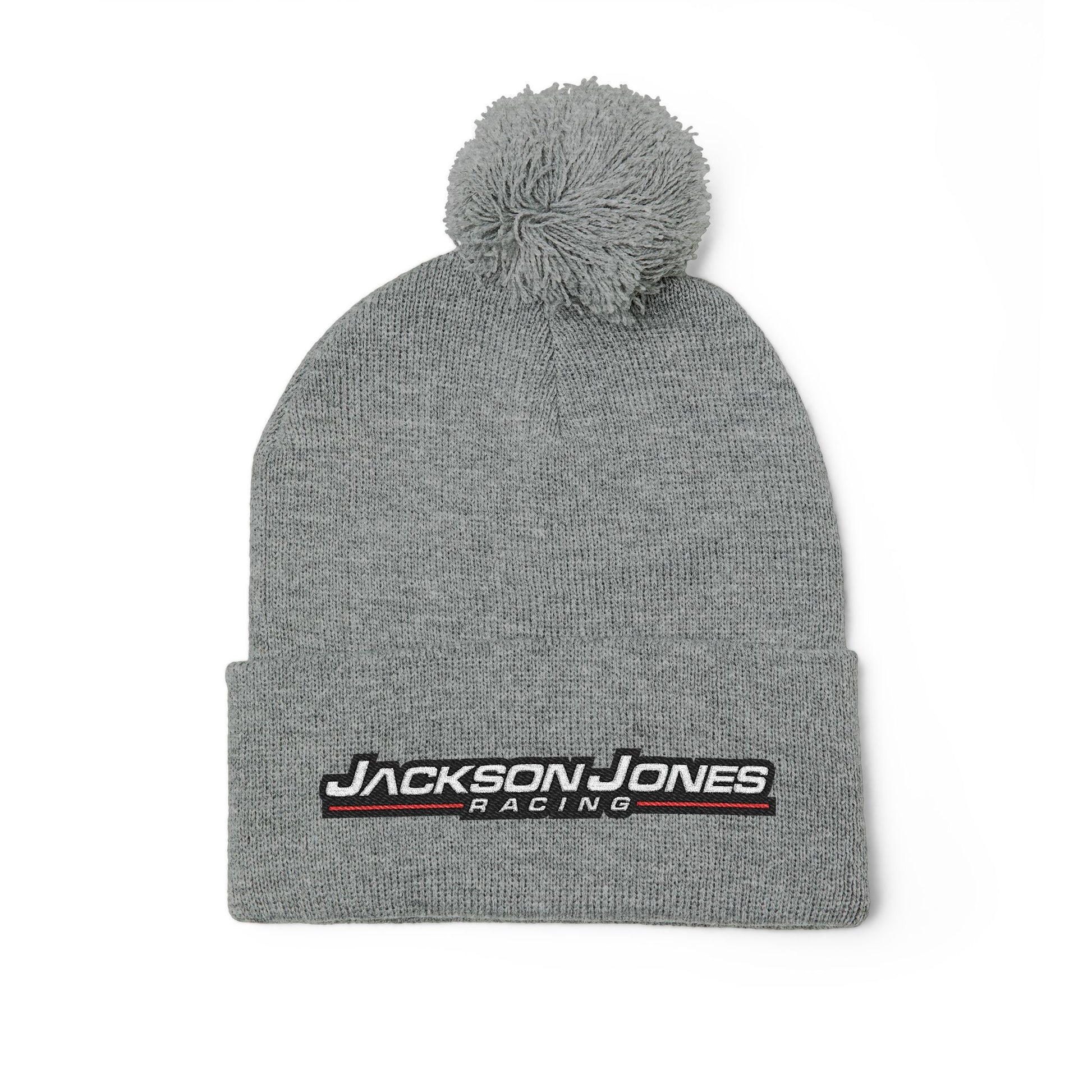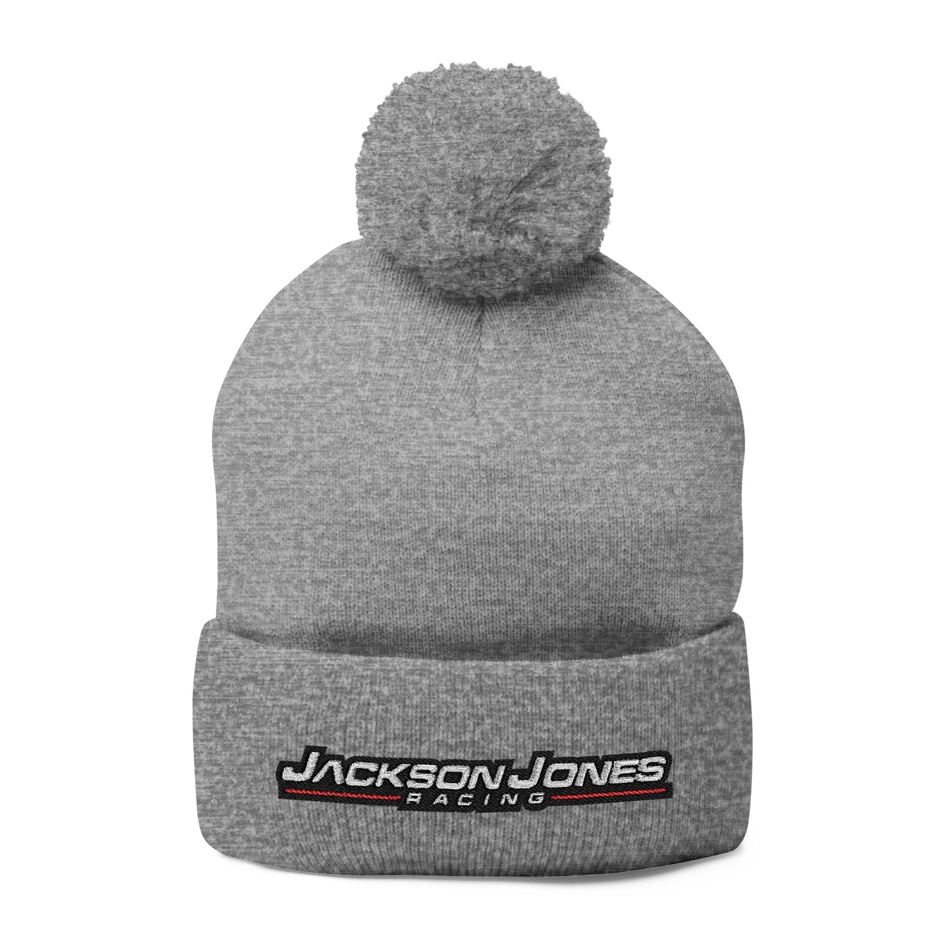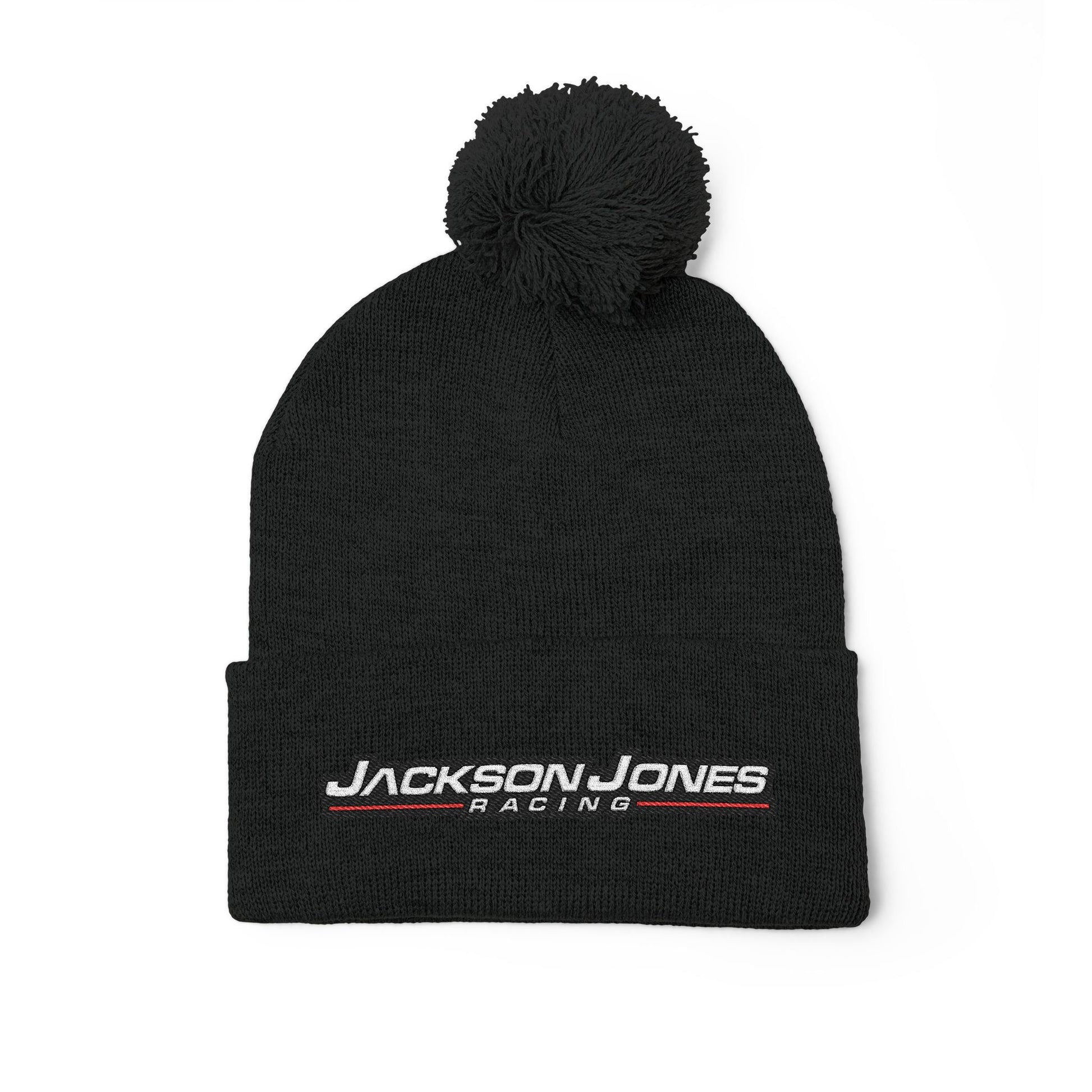 Stay warm and race-ready with the Jackson Jones Pom Beanie. Crafted in soft heather gray with a large, fluffy pom-pom, this knit hat features a double-layer ribbed cuff for a snug, ear-covering fit. Bold racing-inspired embroidery highlights “JACKSON JONES” in black italic block letters with a striking red underline, and “RACING” beneath, delivering a professional motorsport vibe. Perfect for fans and drivers alike, this beanie combines warmth, team spirit, and trackside style for winter days on and off the grid.ight runs.