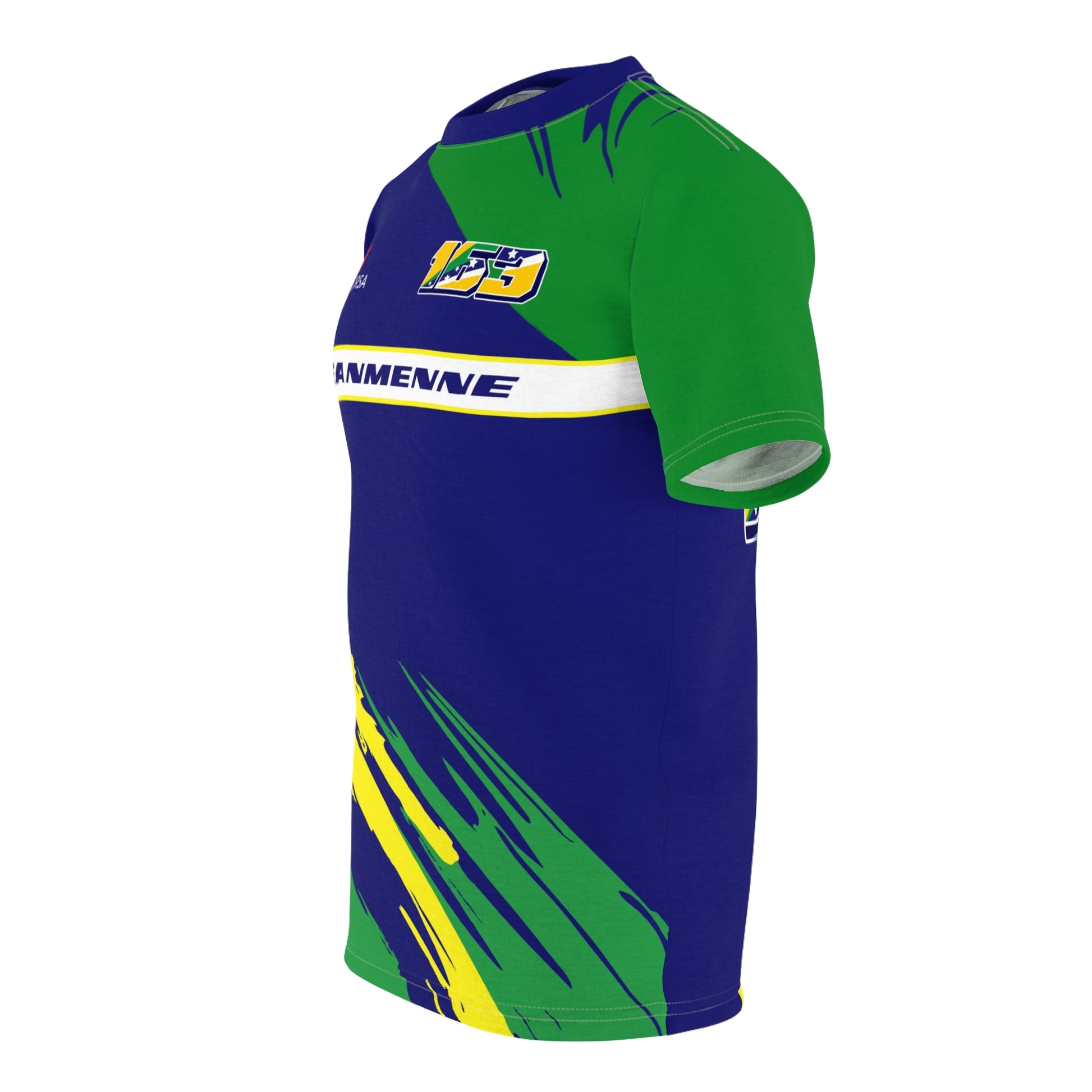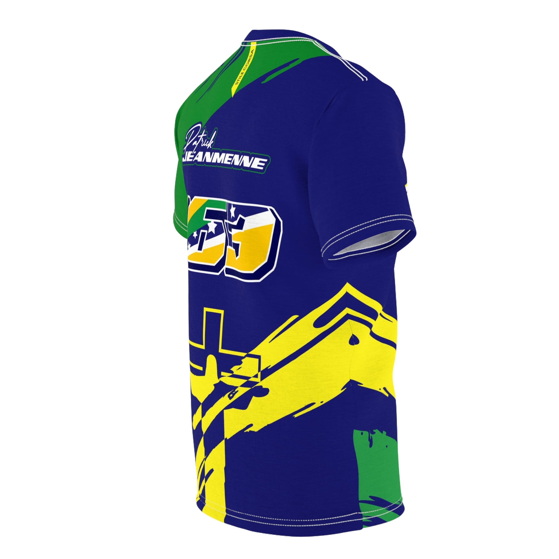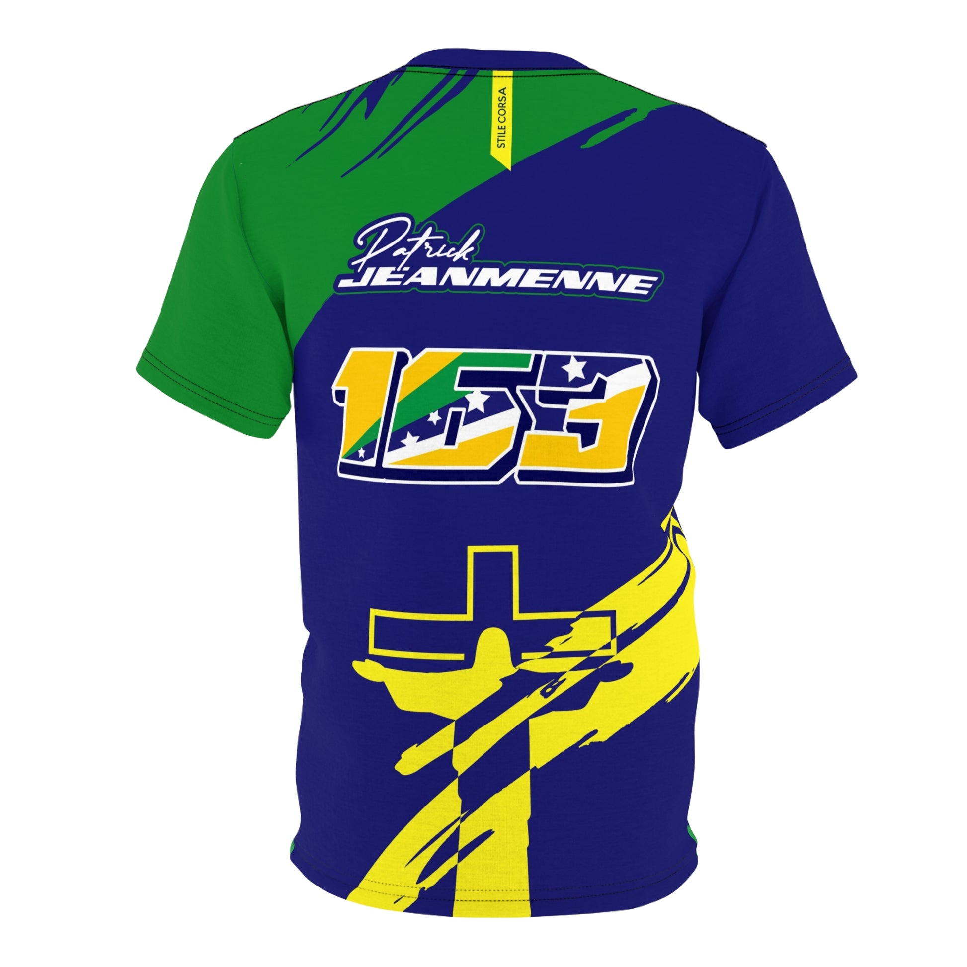 Featuring Patrick’s bold 163 in Brazilian colors, the JEANMENNE name band, and a powerful Christ the Redeemer graphic, this design blends speed, faith, and loyalty into one statement piece.