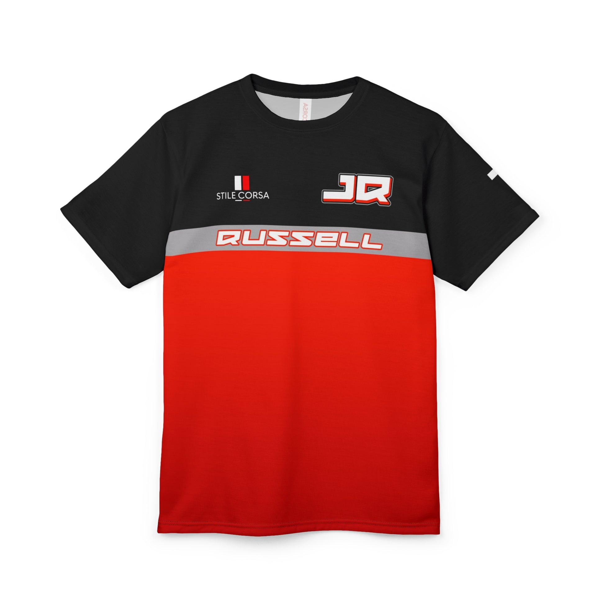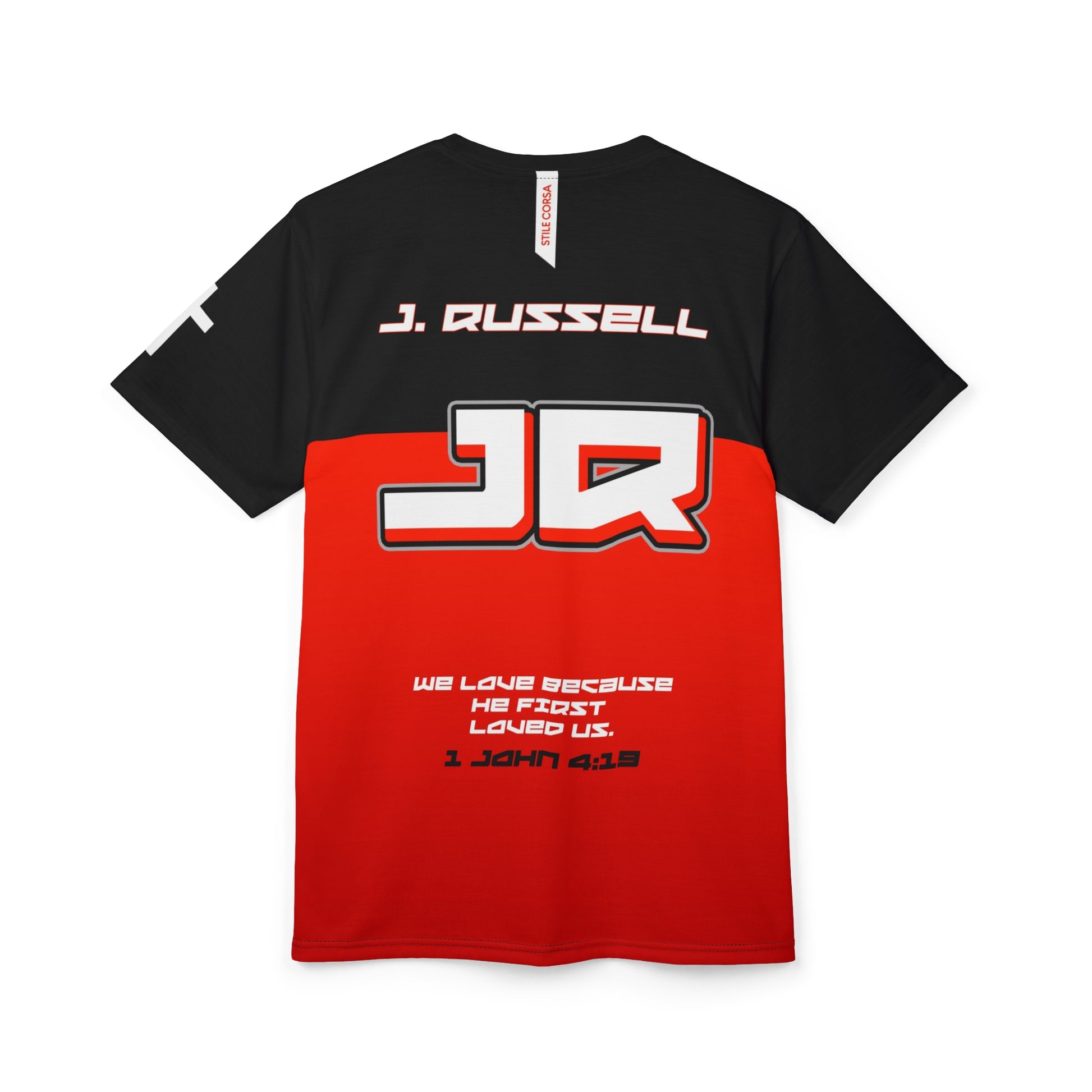 Push the limits with the JR Podium Pursuit Performance Tee, built for racers, fans, and believers in speed and purpose. This bold tee features a dynamic black-to-red color block with a striking gray stripe, highlighting Jack Russell’s JR logo and signature RUSSELL lettering on the front.