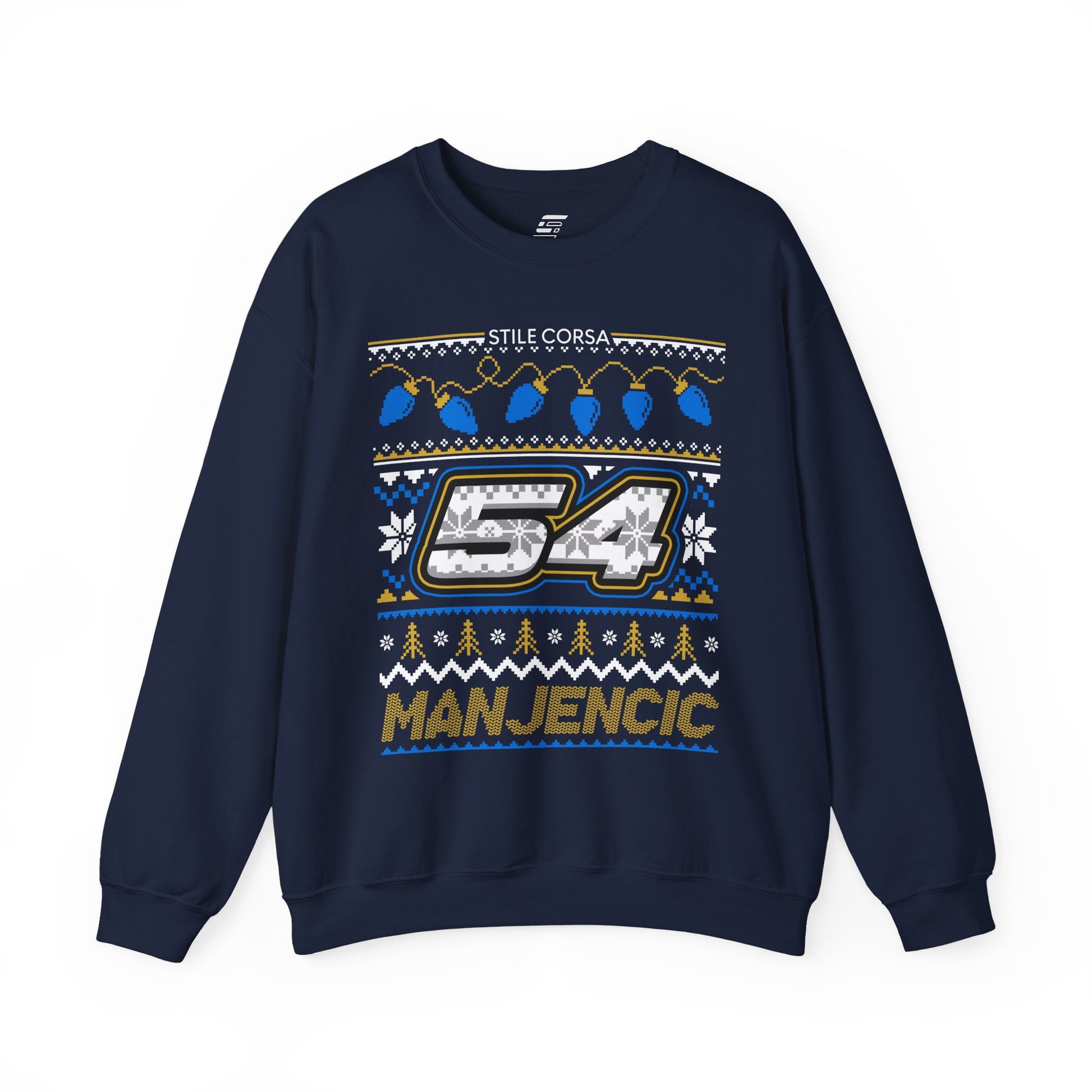 Step into winter with Ethan-Sky Manjencic’s bold holiday essential—the #54 Arctic Crewneck. This deep navy fleece brings cozy comfort and full seasonal energy, wrapped in a high-impact racing “ugly sweater” design. The top band features glowing blue Christmas lights framing the STILE CORSA mark, accented with gold geometric detailing for a festive, track-inspired edge. Front and center, the large 54 stands out in crisp white with a yellow–gold outline and cool blue shadow, filled with a detailed snowflake pattern that gives it an icy, high-speed vibe. Below, a row of yellow Christmas trees and blue snowflakes sets the winter mood, leading into MANJENCIC in bold yellow pixel lettering with a blue underline.
