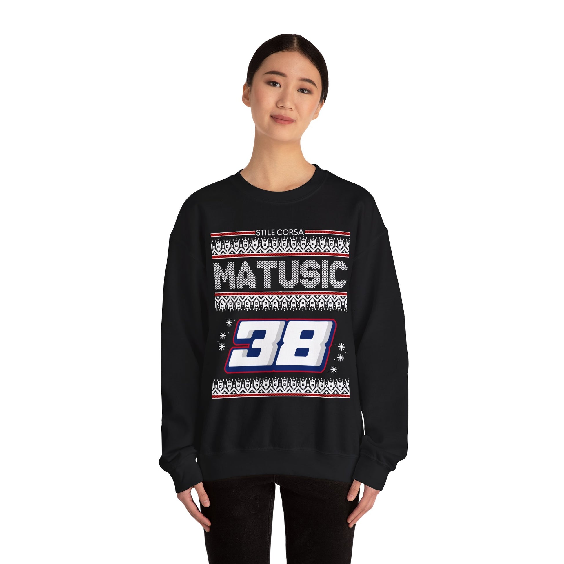 Stay warm this winter with the Matusic #38 North Pole Crewneck, a perfect blend of holiday spirit and motorsport energy. Made from soft navy fleece with a relaxed unisex fit, it features a bold “ugly sweater” racing print in white, red, and navy. The front showcases “MATUSIC” in crisp white pixel block letters with a navy shadow, a large “38” with white snowflake accents and thick red outline, and festive Nordic patterns along the top and bottom bands. Ribbed cuffs, hem, and collar ensure cozy comfort while giving a track-ready, winter-inspired look.