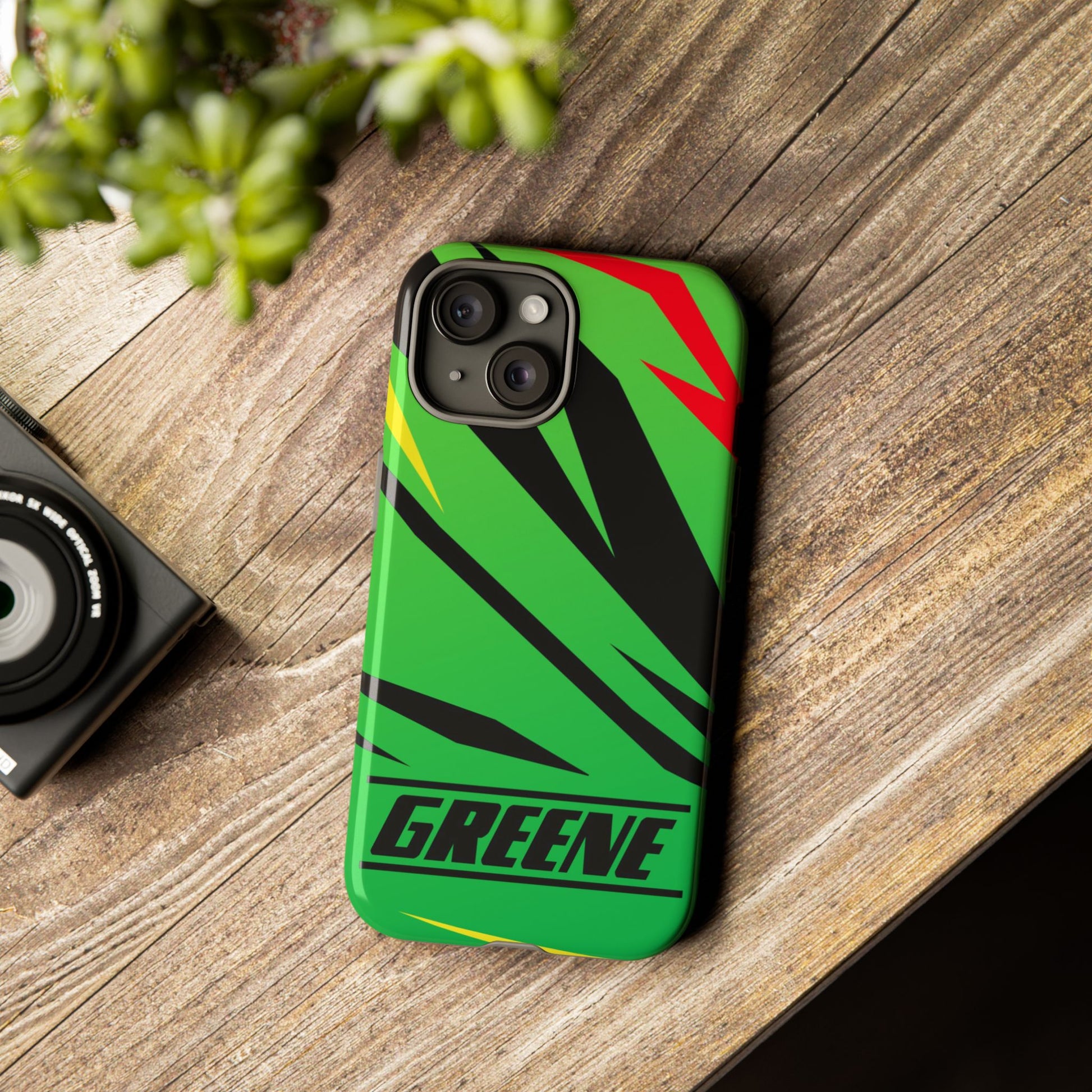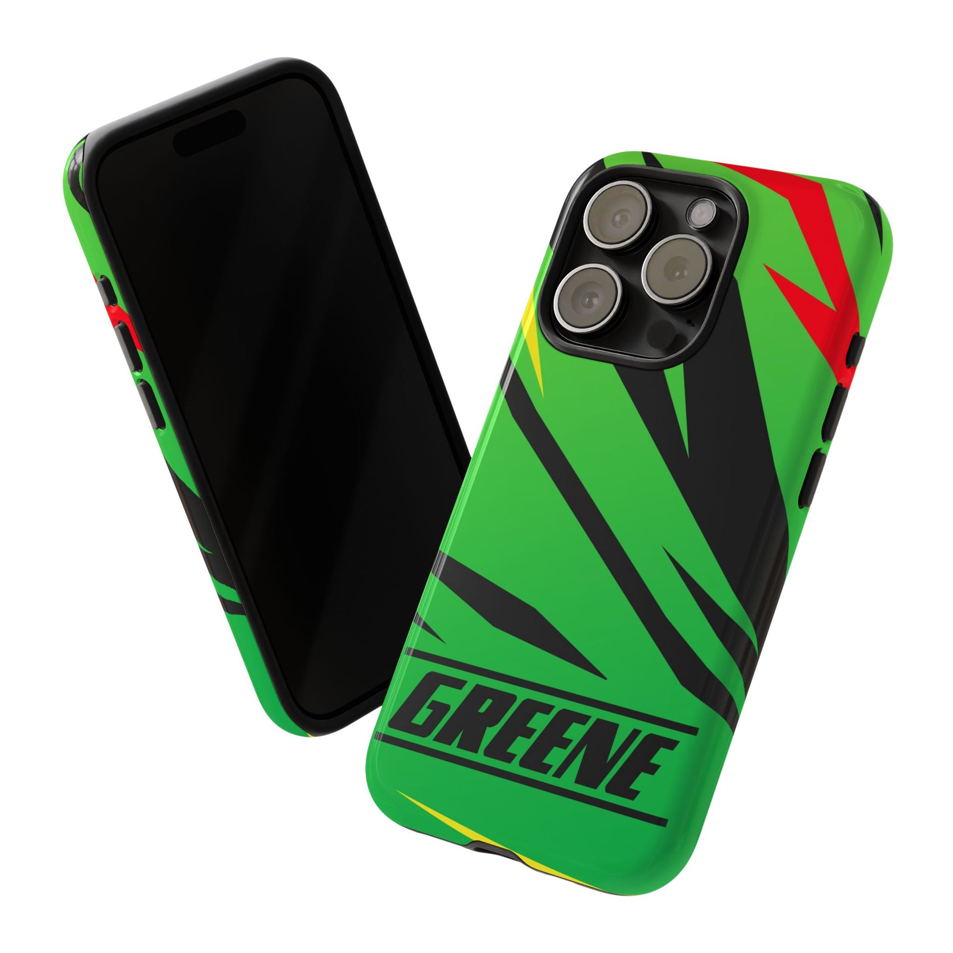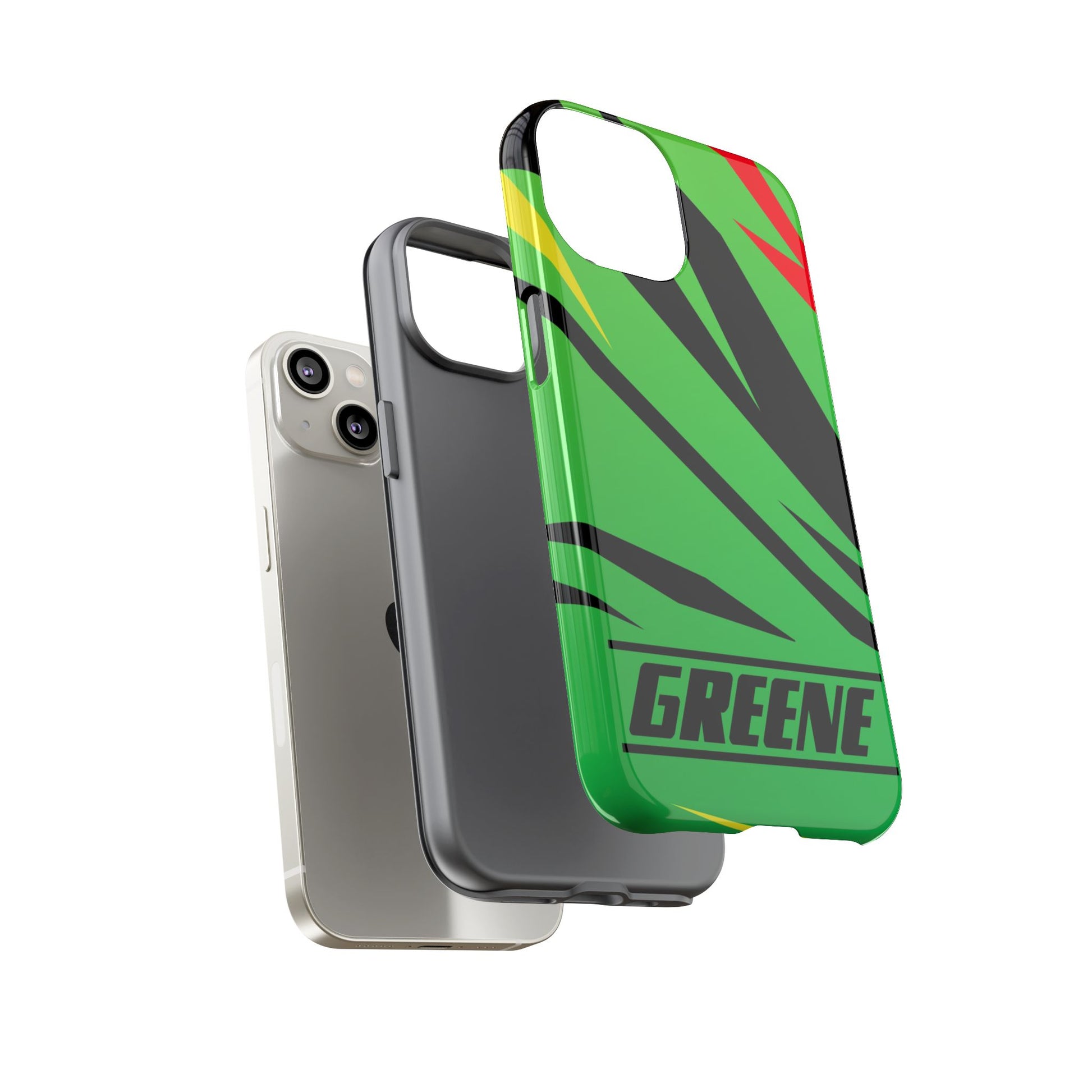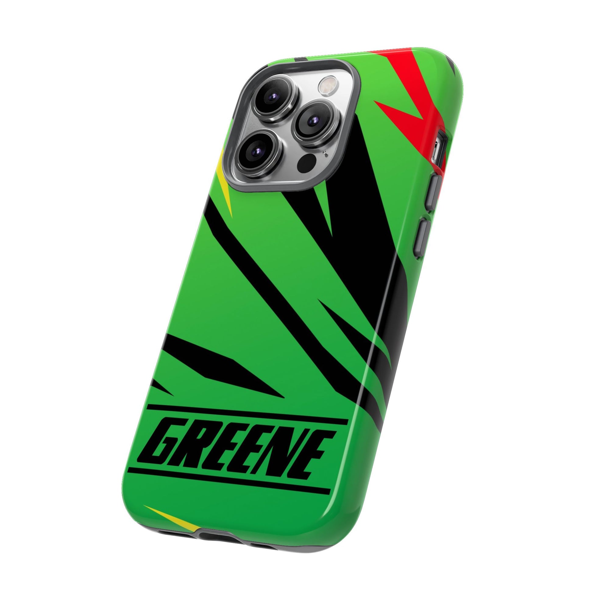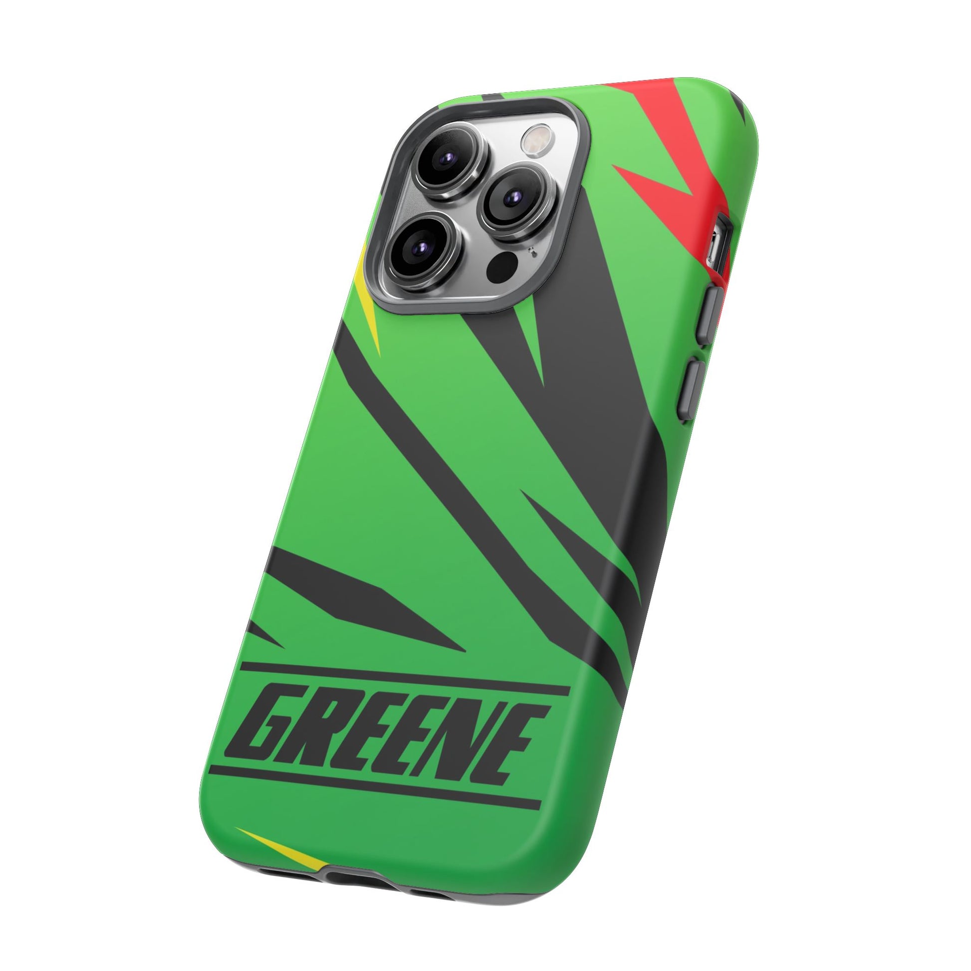Turn every call, text, and scroll into a statement of speed and style. This case features a vibrant green backdrop electrified with black, red, and yellow diagonal streaks, capturing the raw adrenaline of the track. The bold “GREENE” lettering across the base seals it as part of Nate’s signature collection.