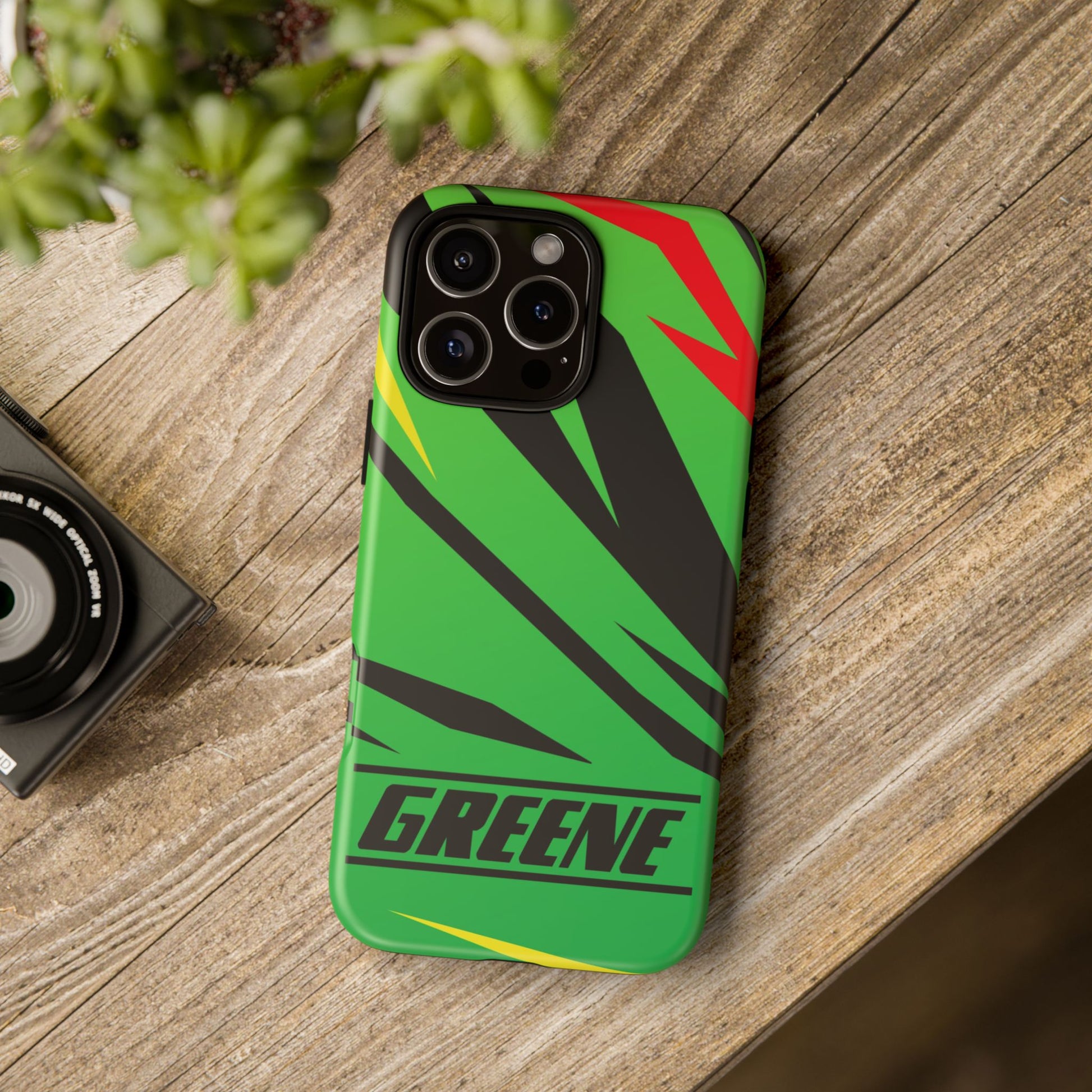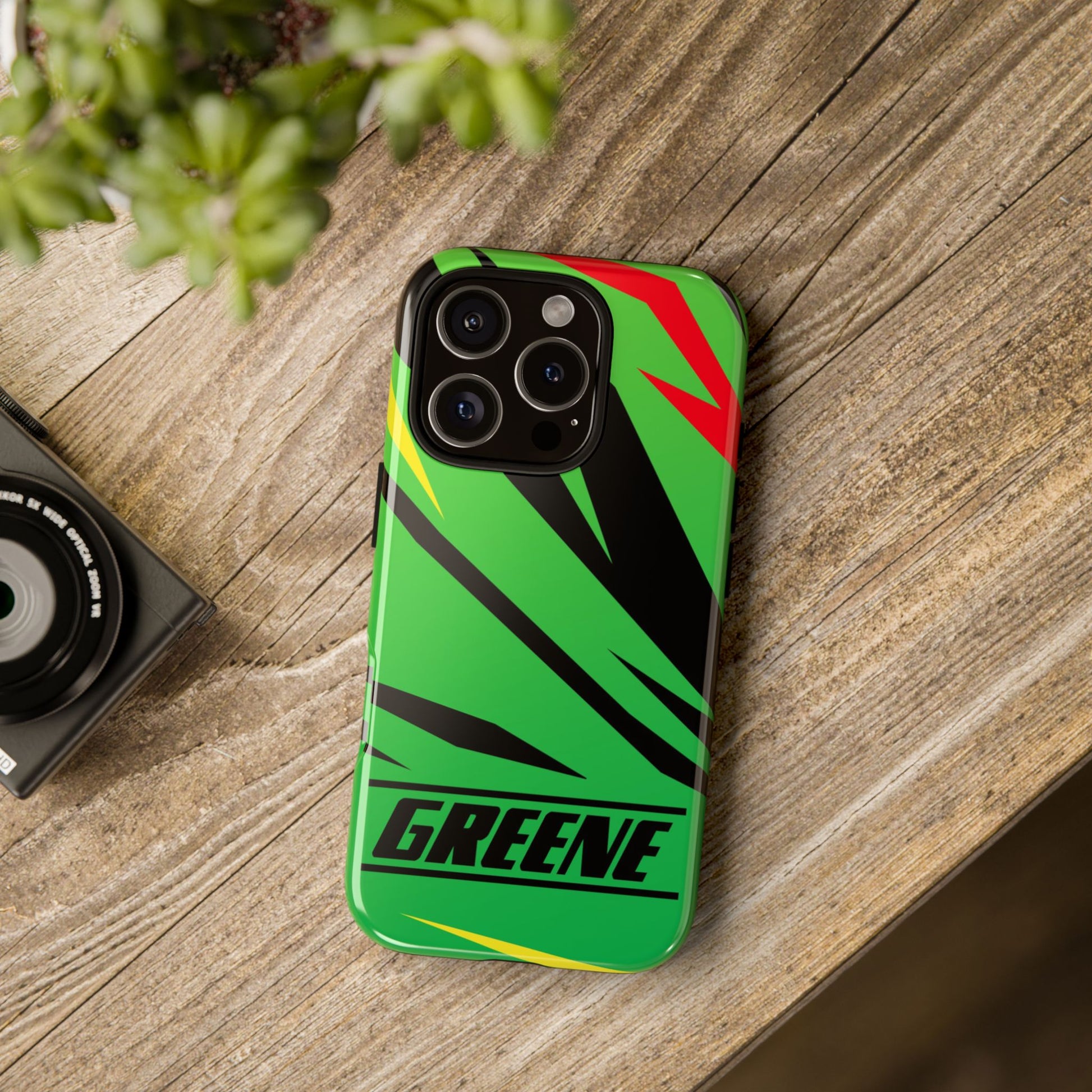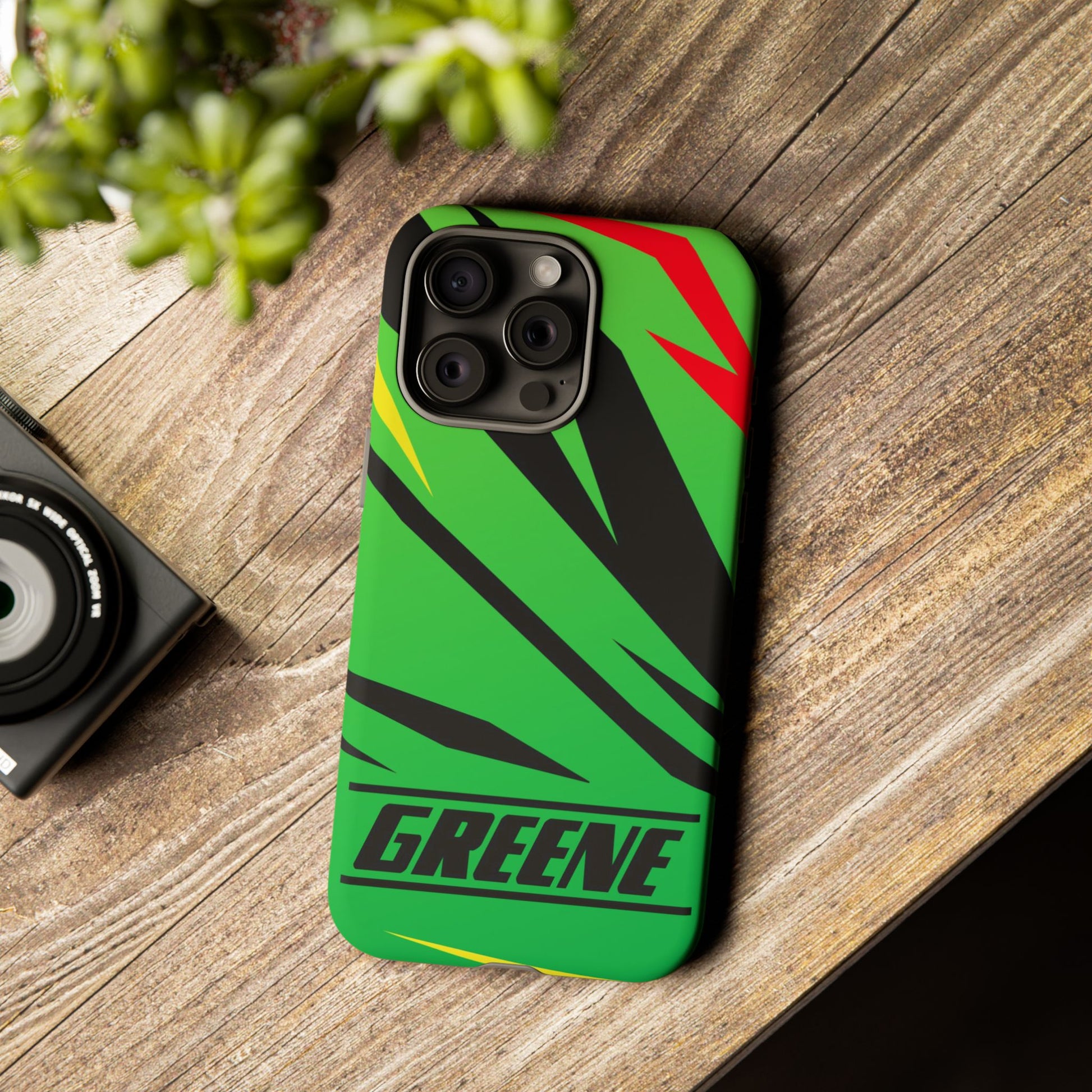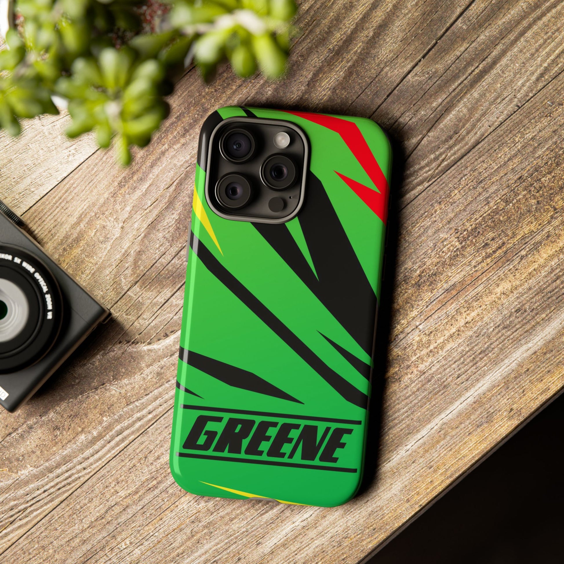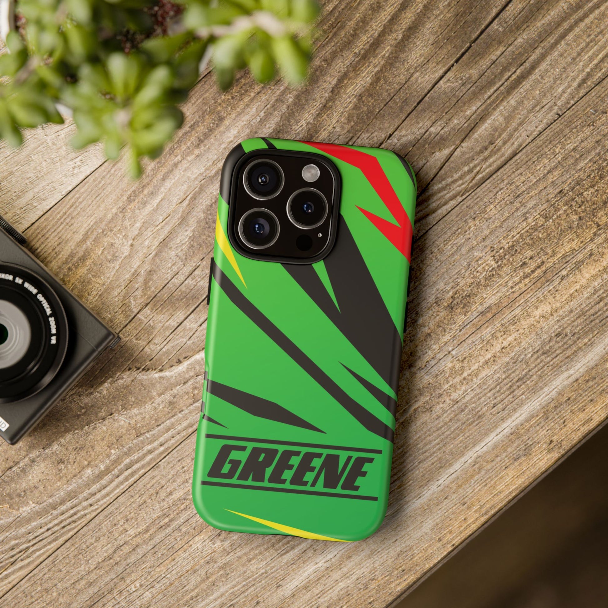 Turn every call, text, and scroll into a statement of speed and style. This case features a vibrant green backdrop electrified with black, red, and yellow diagonal streaks, capturing the raw adrenaline of the track. The bold “GREENE” lettering across the base seals it as part of Nate’s signature collection.