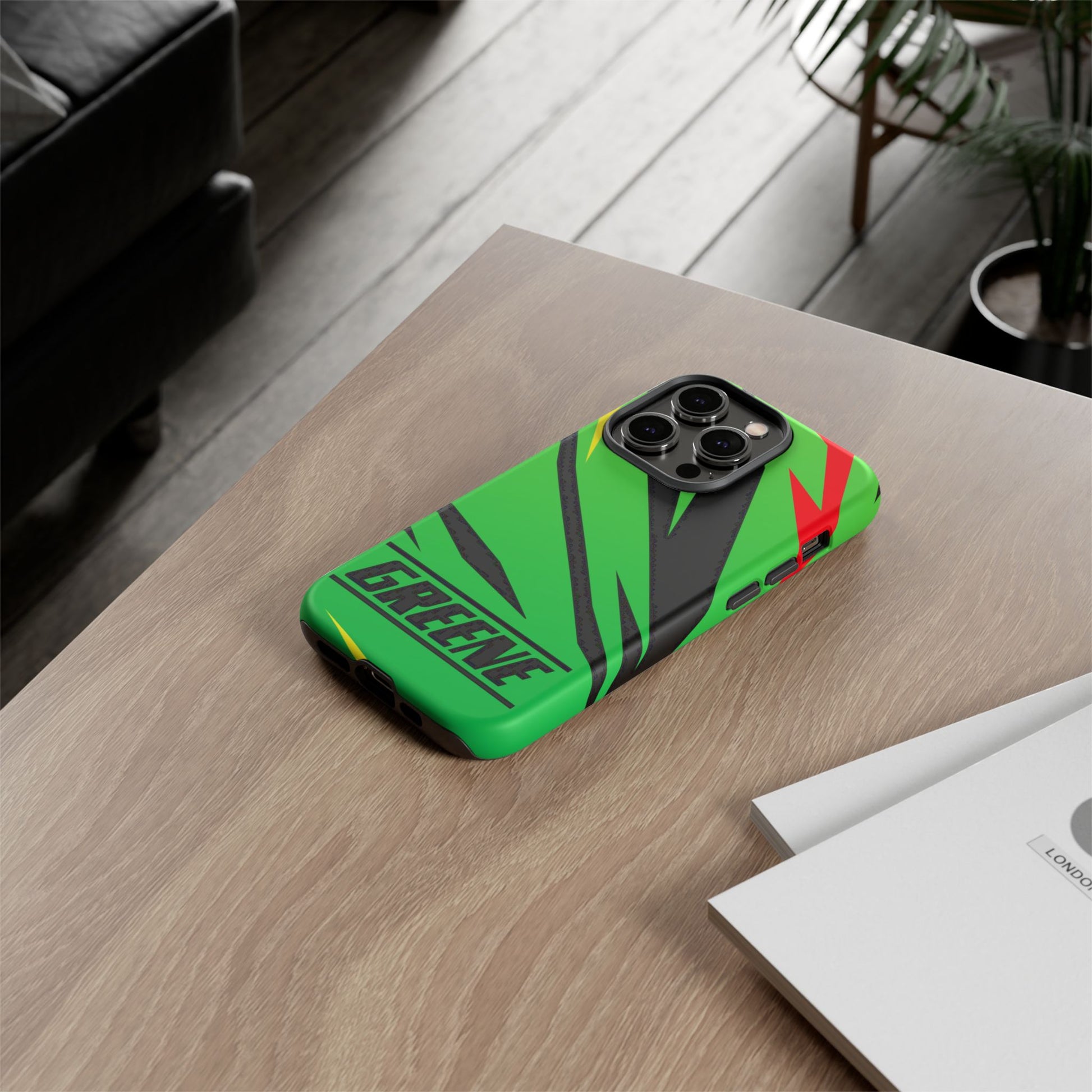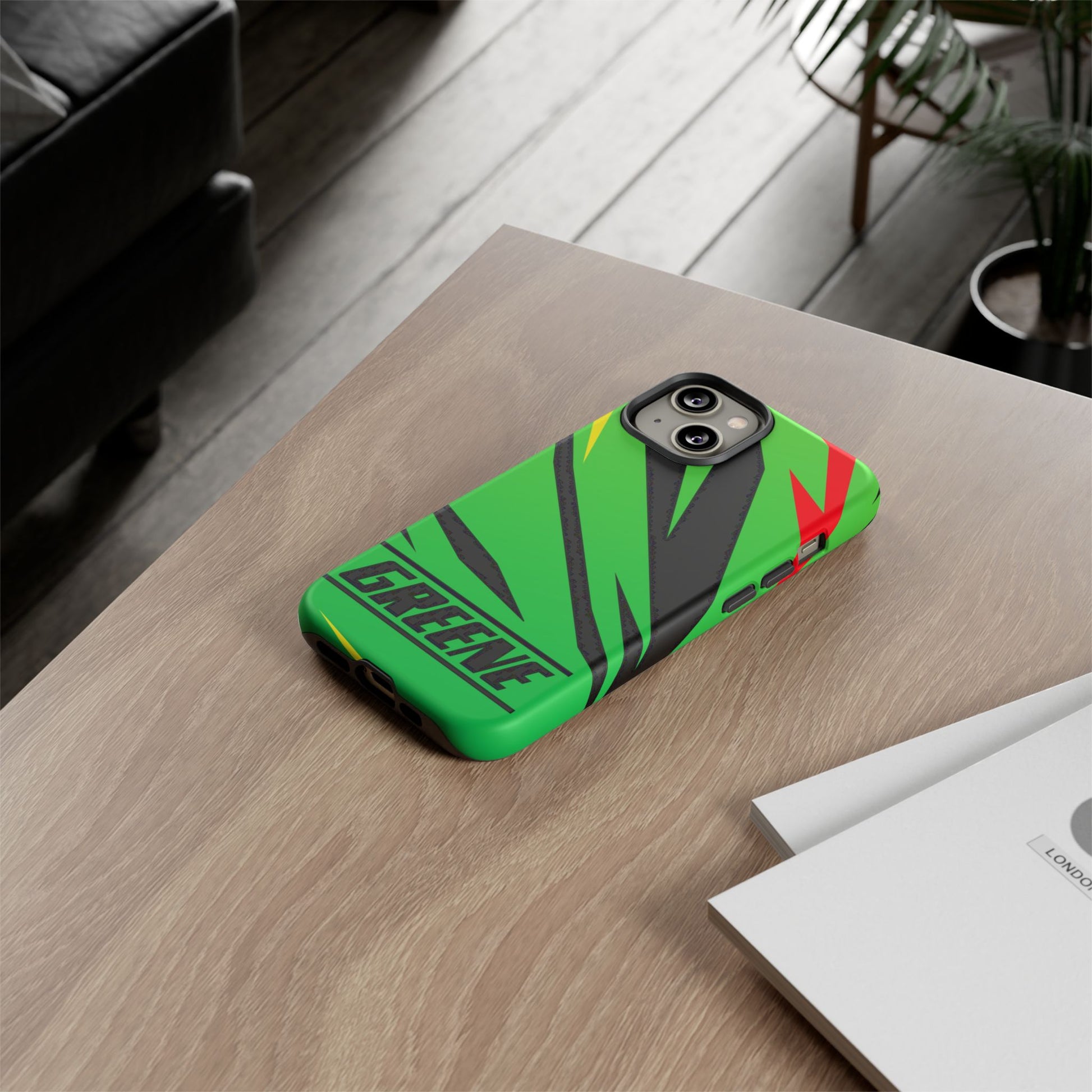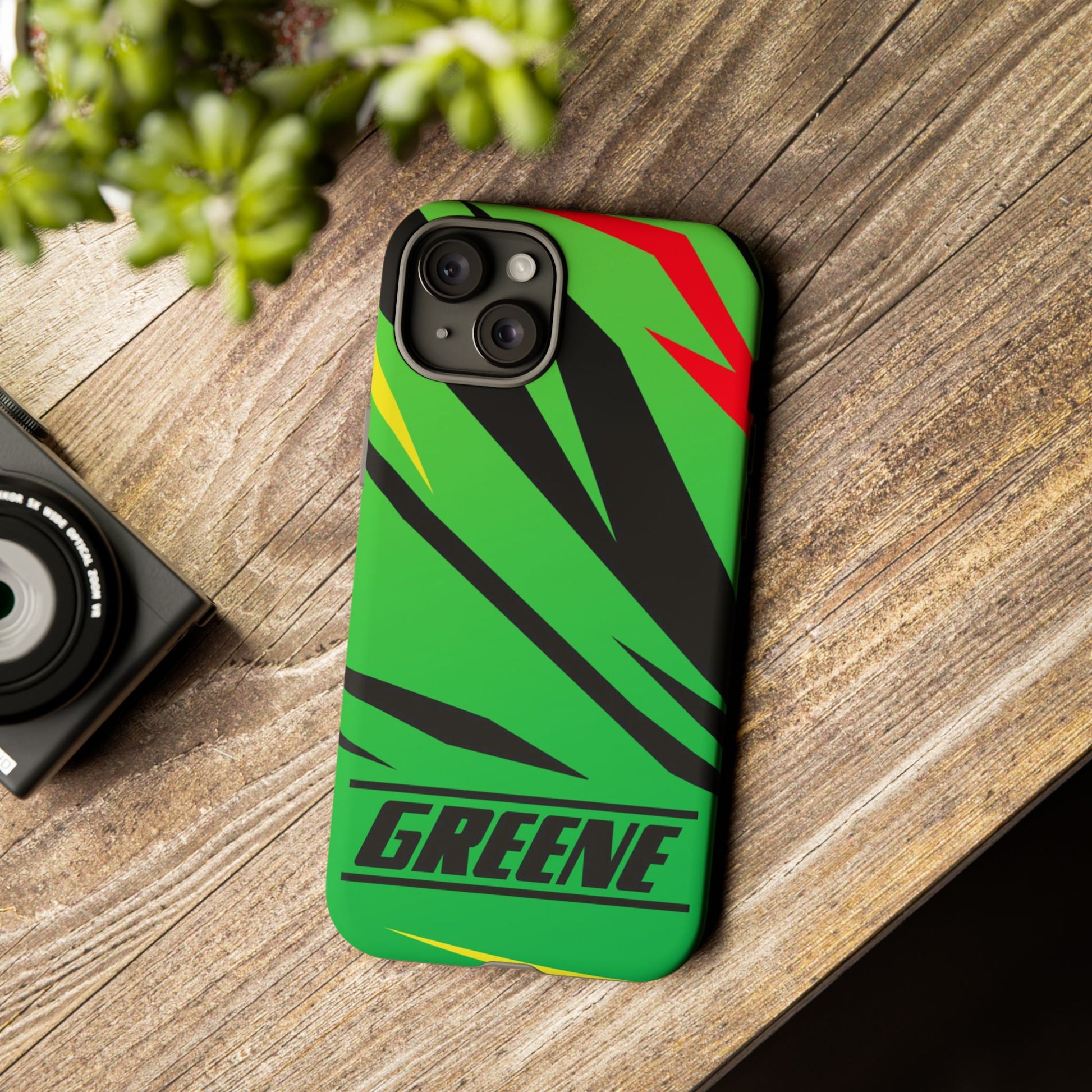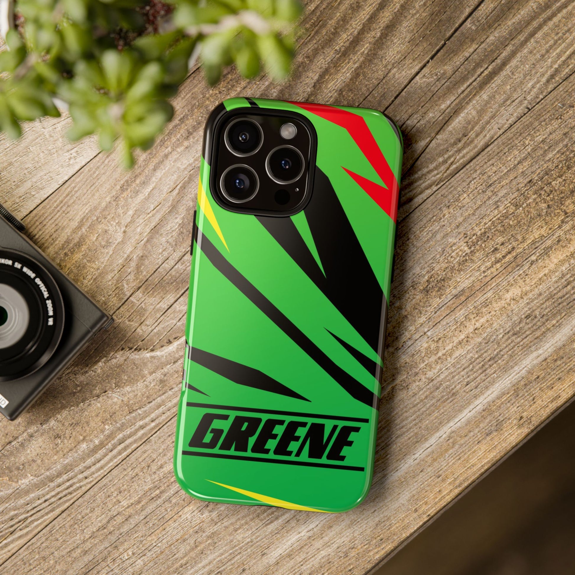 Turn every call, text, and scroll into a statement of speed and style. This case features a vibrant green backdrop electrified with black, red, and yellow diagonal streaks, capturing the raw adrenaline of the track. The bold “GREENE” lettering across the base seals it as part of Nate’s signature collection.