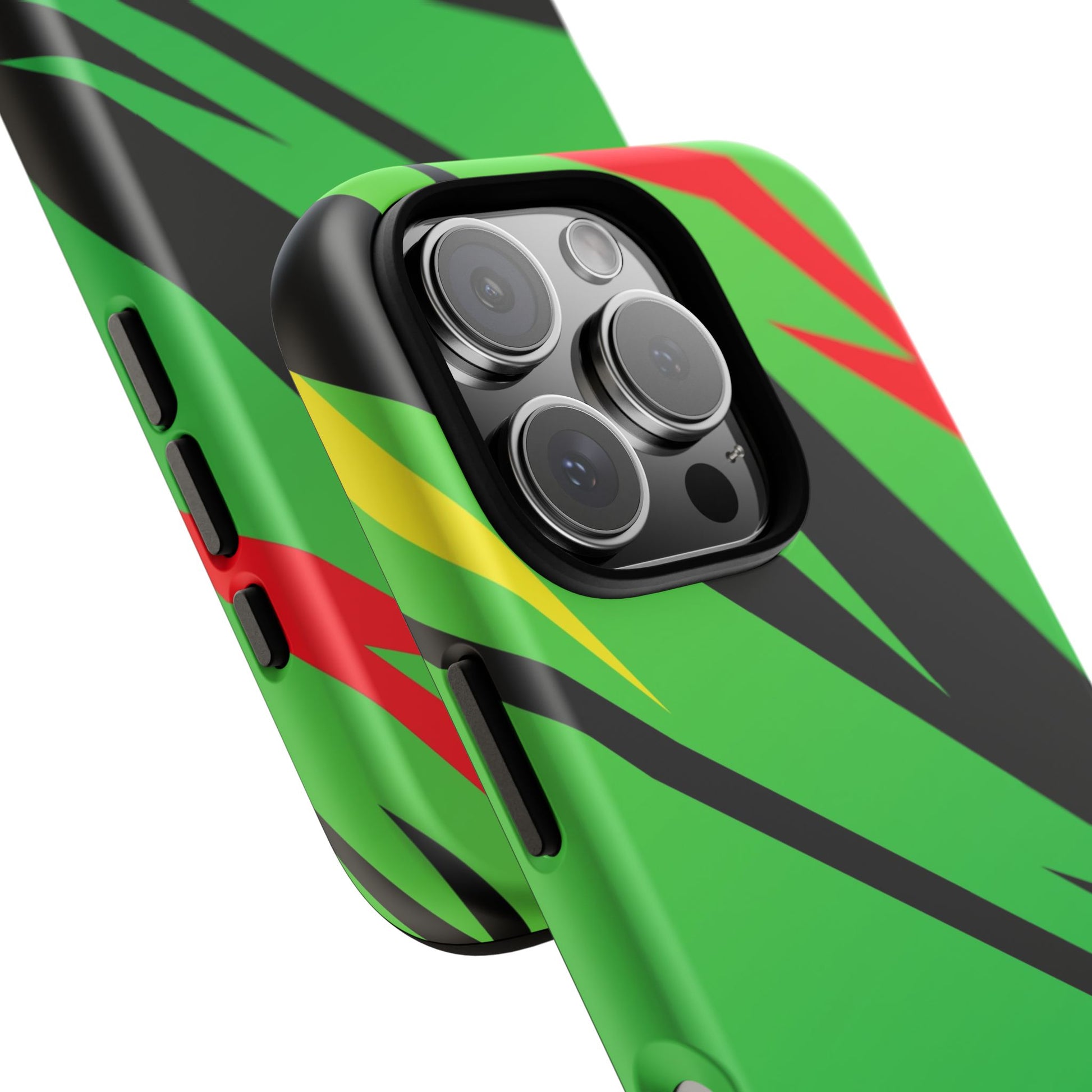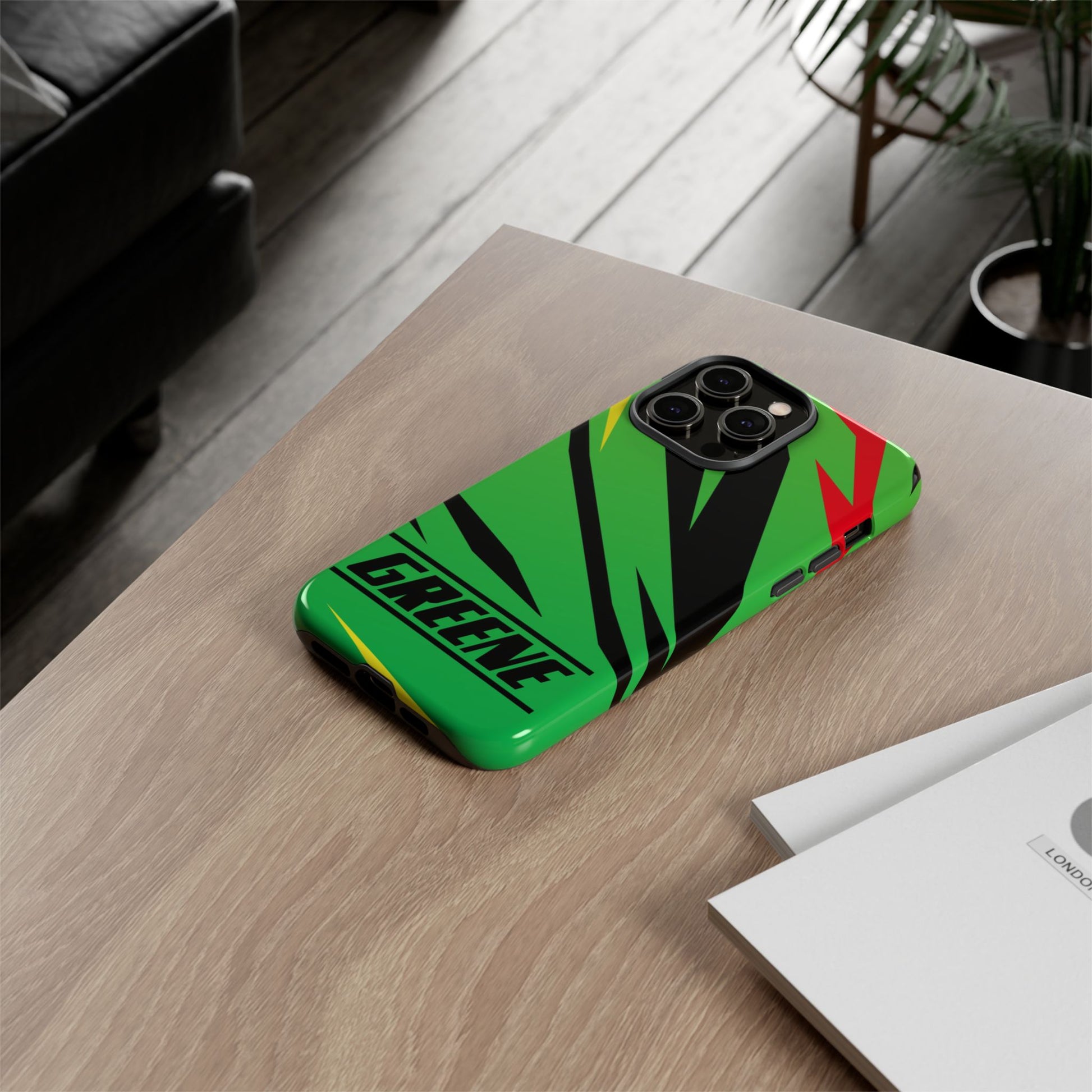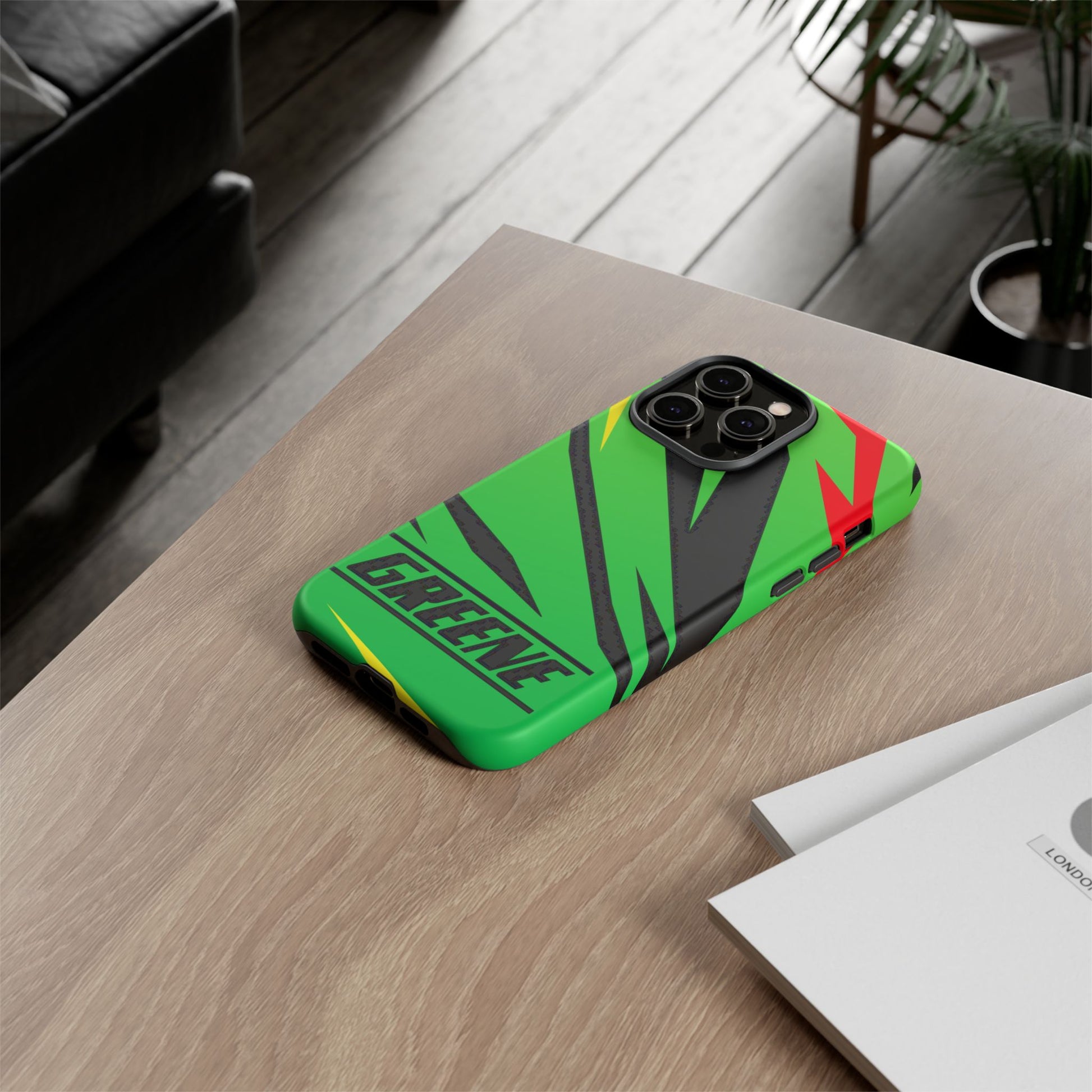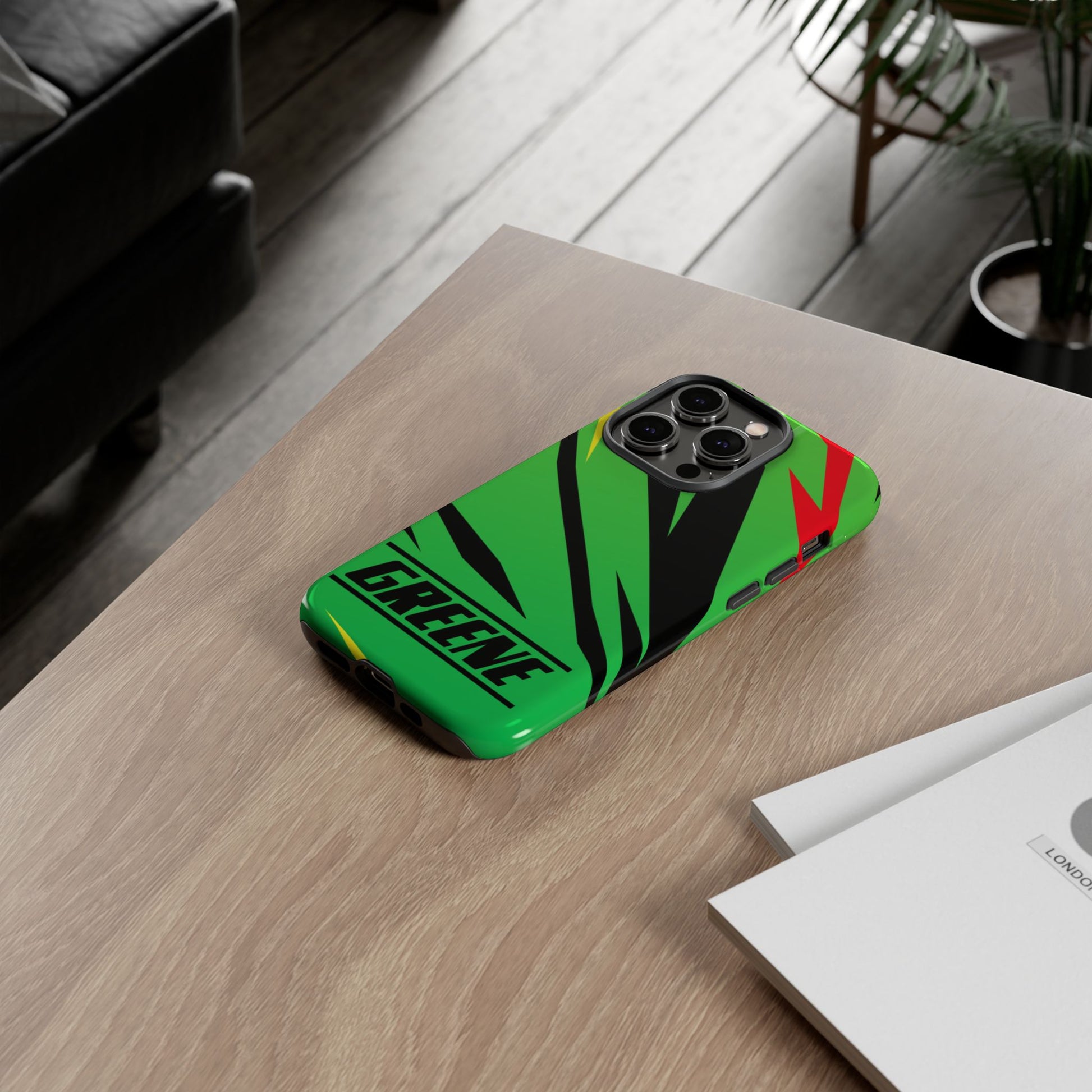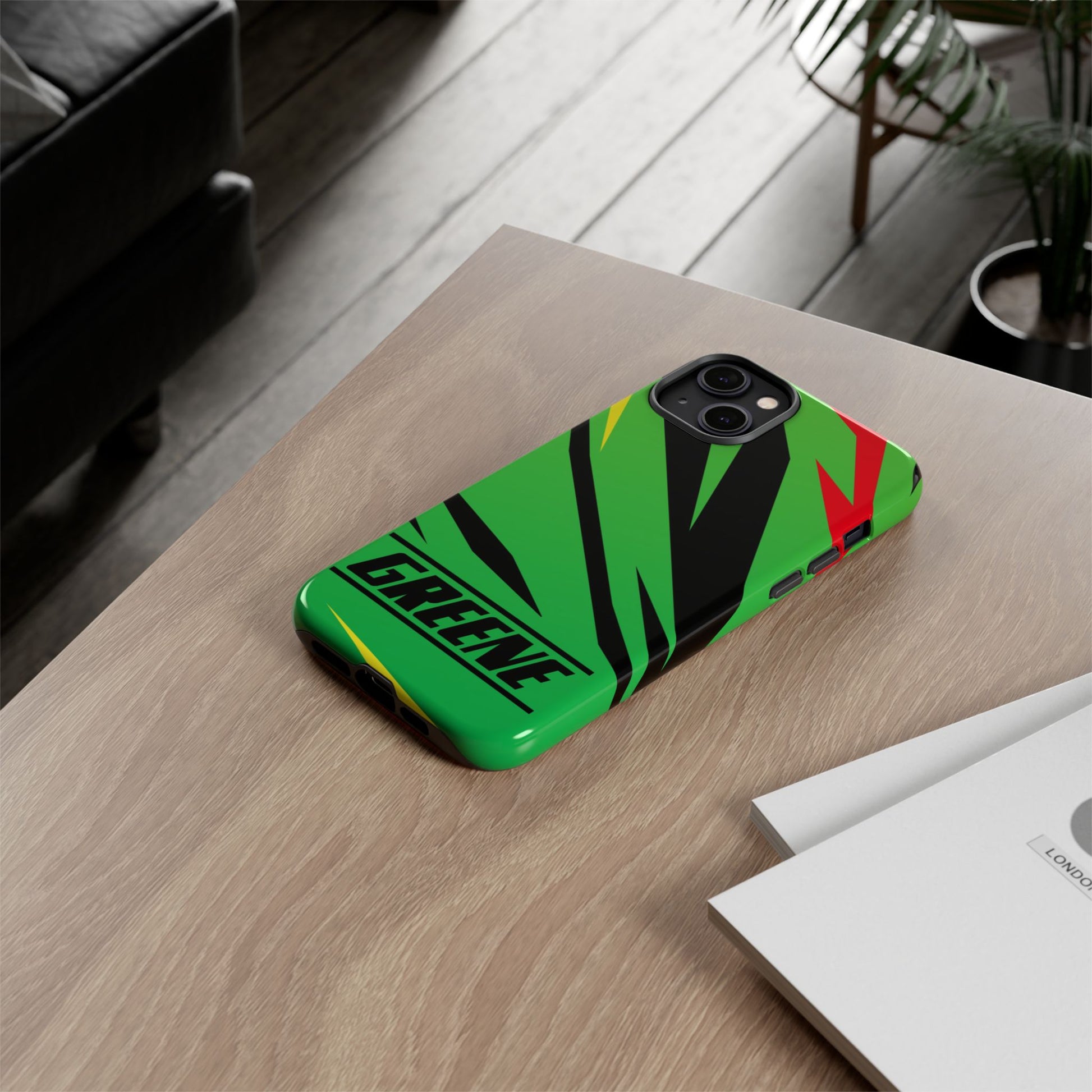 Turn every call, text, and scroll into a statement of speed and style. This case features a vibrant green backdrop electrified with black, red, and yellow diagonal streaks, capturing the raw adrenaline of the track. The bold “GREENE” lettering across the base seals it as part of Nate’s signature collection.