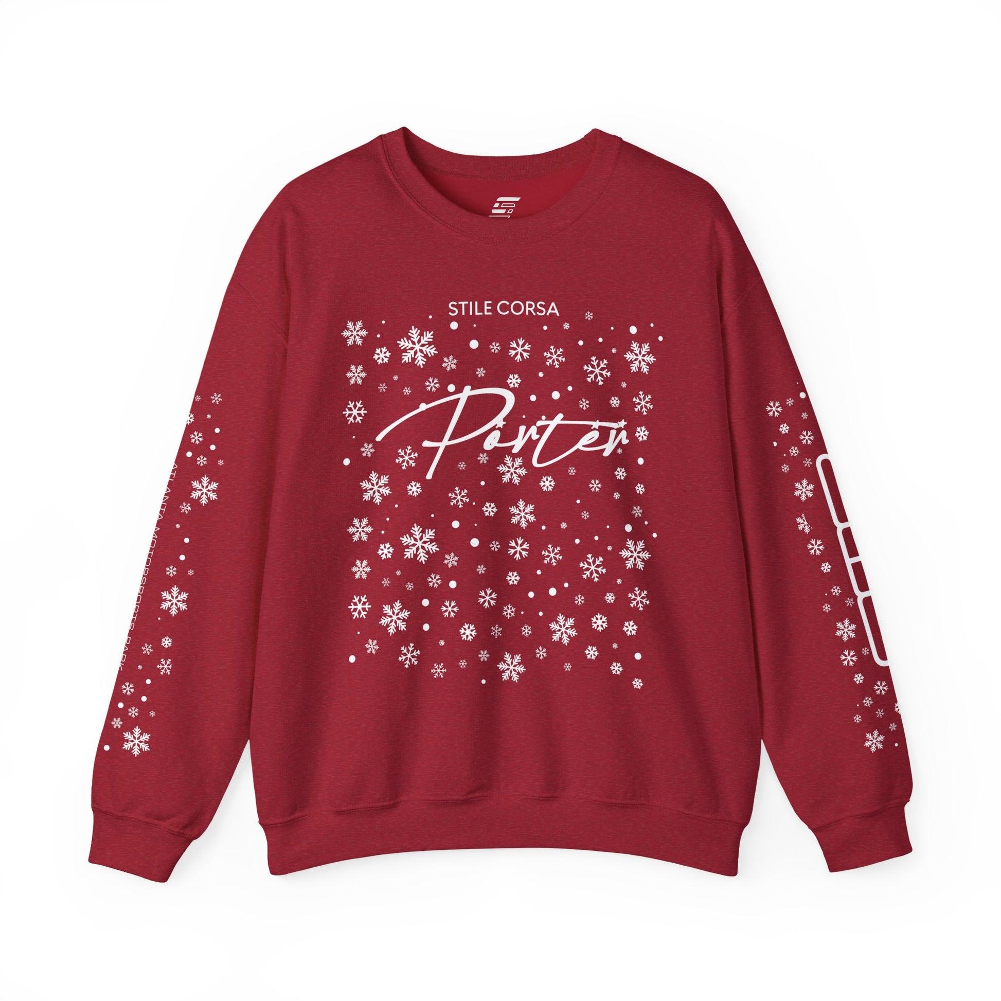Across the chest, a bold script “Porter” sits over a clean STILE CORSA mark, framed by a dense cascade of snowflakes that creates a dynamic, track-like vertical flow. The snow pattern continues down both sleeves, adding motion and symmetry inspired by cold-weather racing visuals.