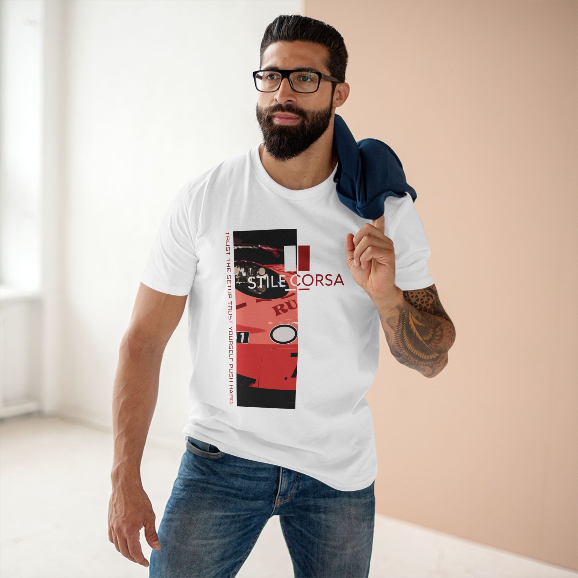 A bold vertical panel features a scarlet race car nose in full attack mode, stamped with the iconic #1 — a symbol of focus, confidence, and winning intent. Signature Italian racing bars and oversized STILE CORSA branding anchor the design in heritage and discipline.