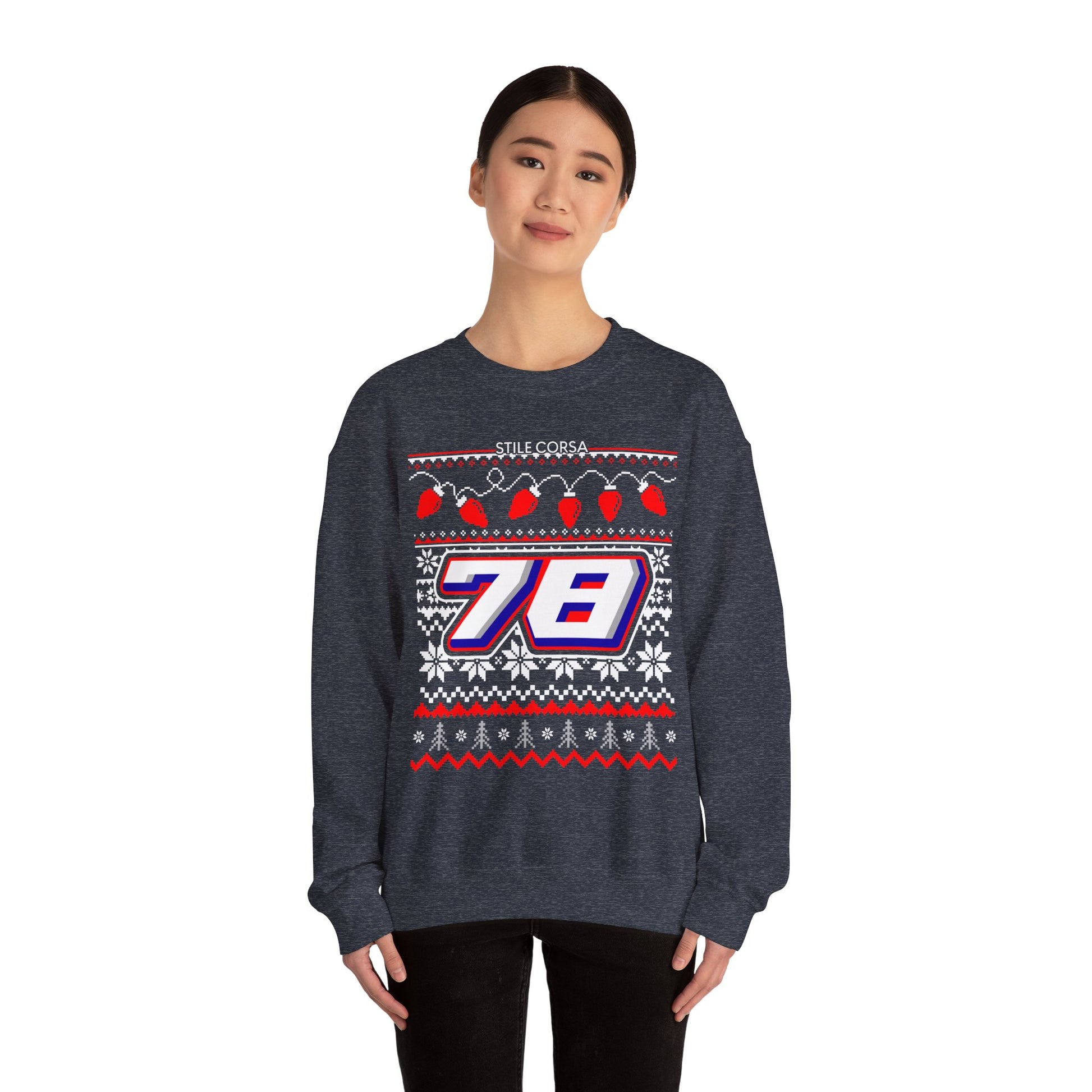 This heather royal blue sweatshirt is made from soft twfleece and crafted in a relaxed unisex fit, perfect for track days, holiday nights, and everything in between. The front features a bold “ugly sweater” racing design in white, red, and blue, starting with a festive STILE CORSA header and a bright string of red Christmas lights.