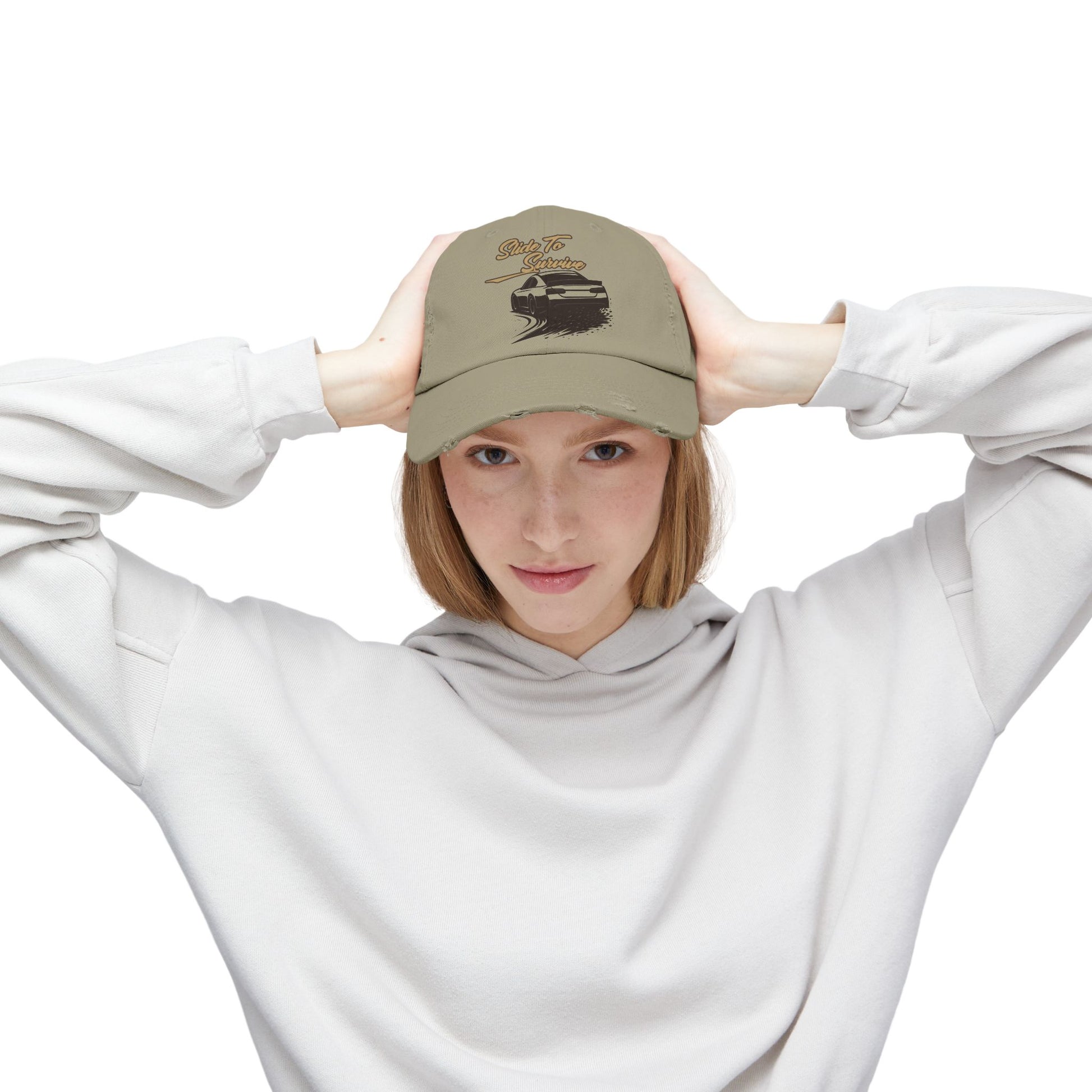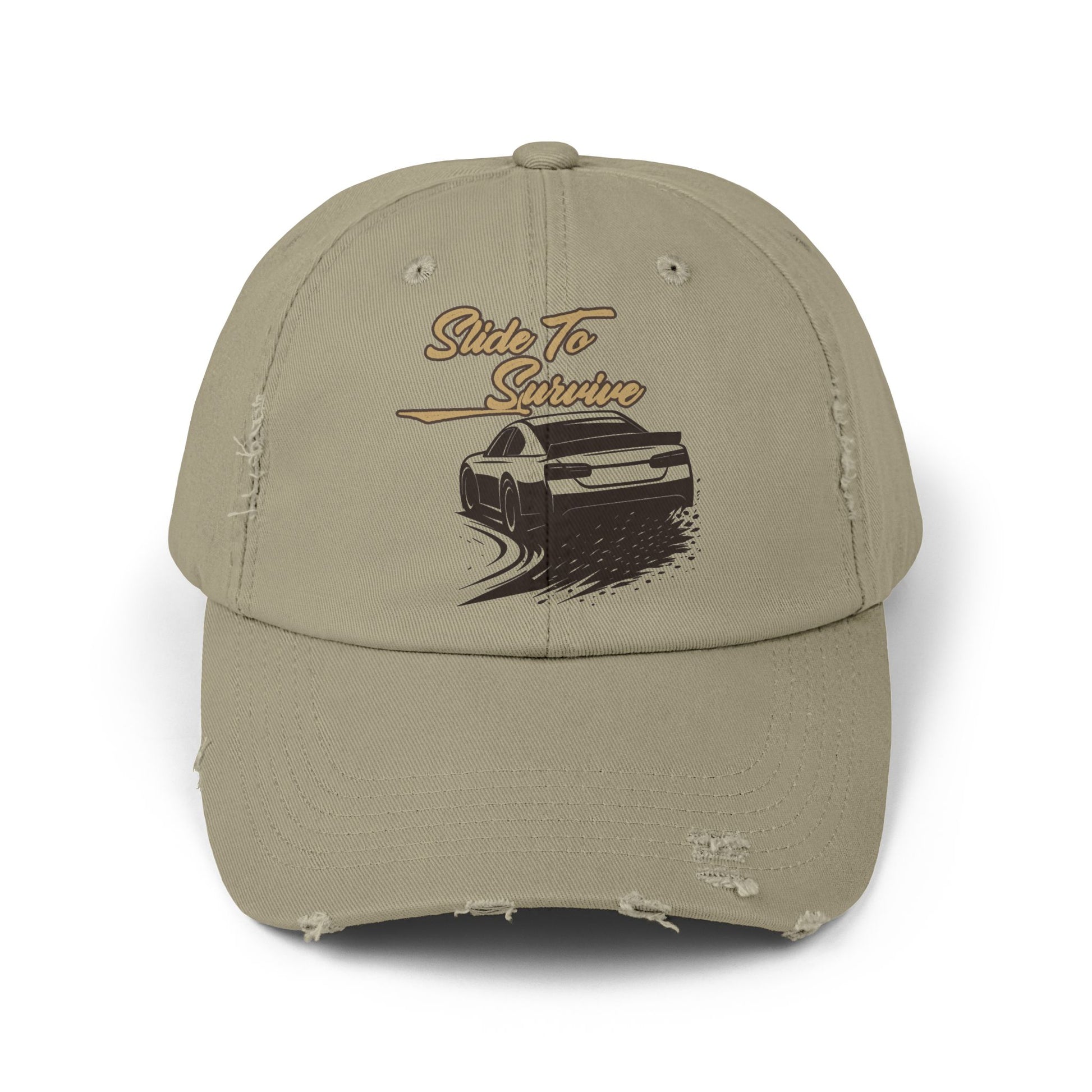 Slide to Survive Automotive Cap inspired by stock car racing on dirt. This distressed cap gives a vintage look and feel, making it perfect for everyday wear. It is ideal for racing enthusiasts and those who enjoy automotive culture. Relevant for events like car races, automotive shows, and vintage car gatherings.